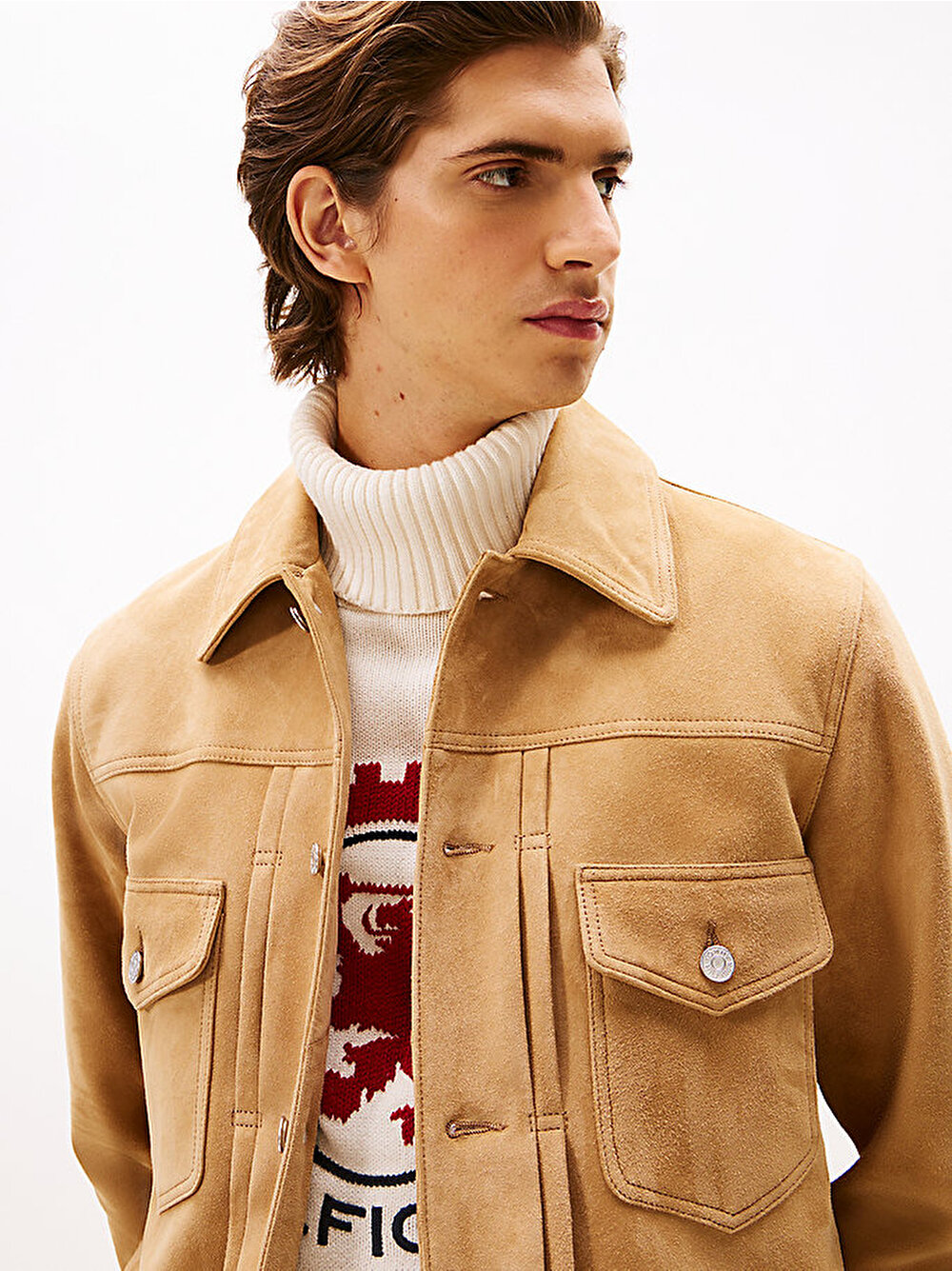 Sağlam bir tasarıma sofistike bir yaklaşım için pürüzsüz süetten üretilen bu trucker ceketi ile kombinlerinize rafine bir görünüm katın.