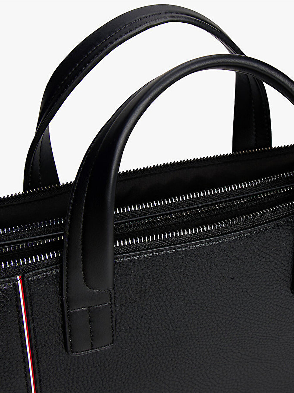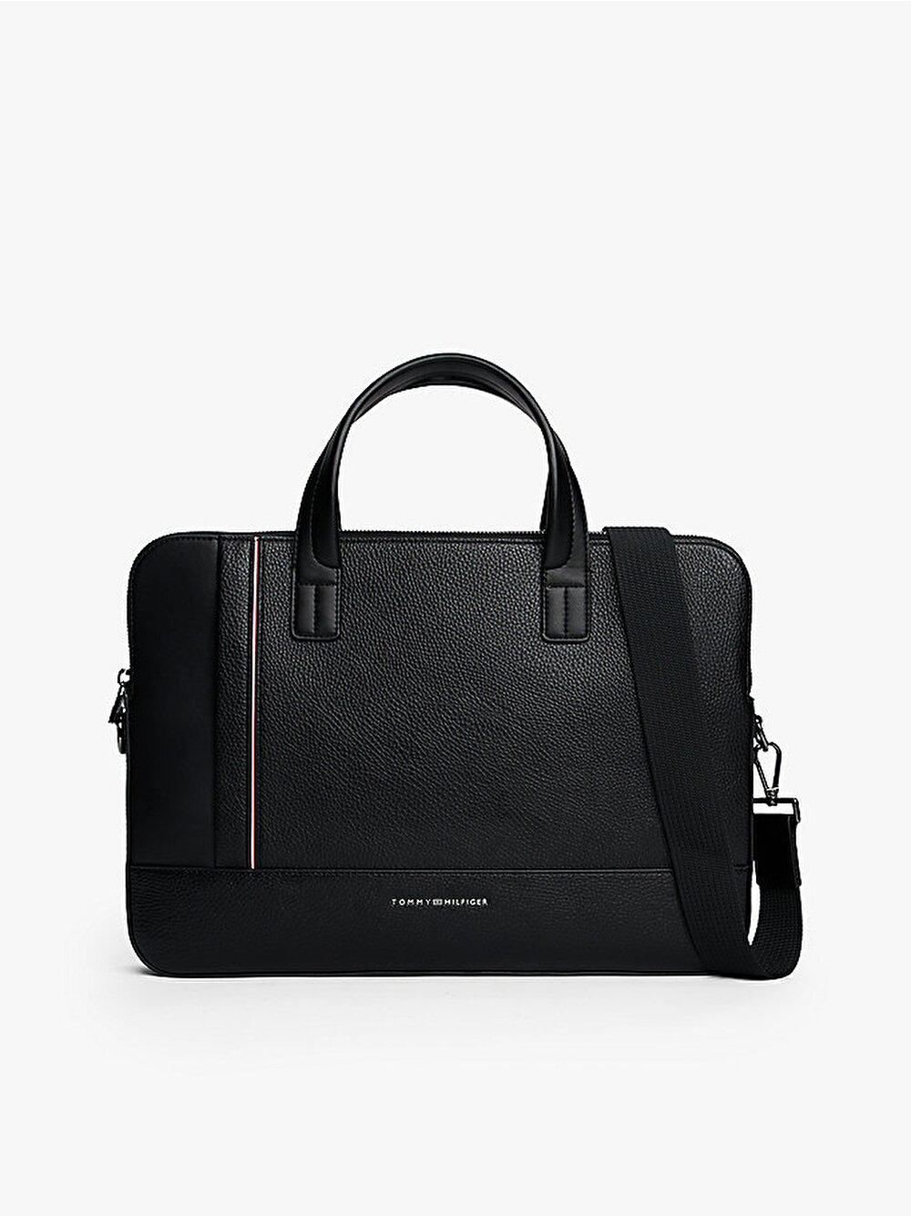 Ön kısmında çarpıcı imza detaylarıyla tamamlanan bu ince çakıl taşı dokulu dizüstü bilgisayar çantasıyla teknolojinizi şık bir şekilde taşıyın.