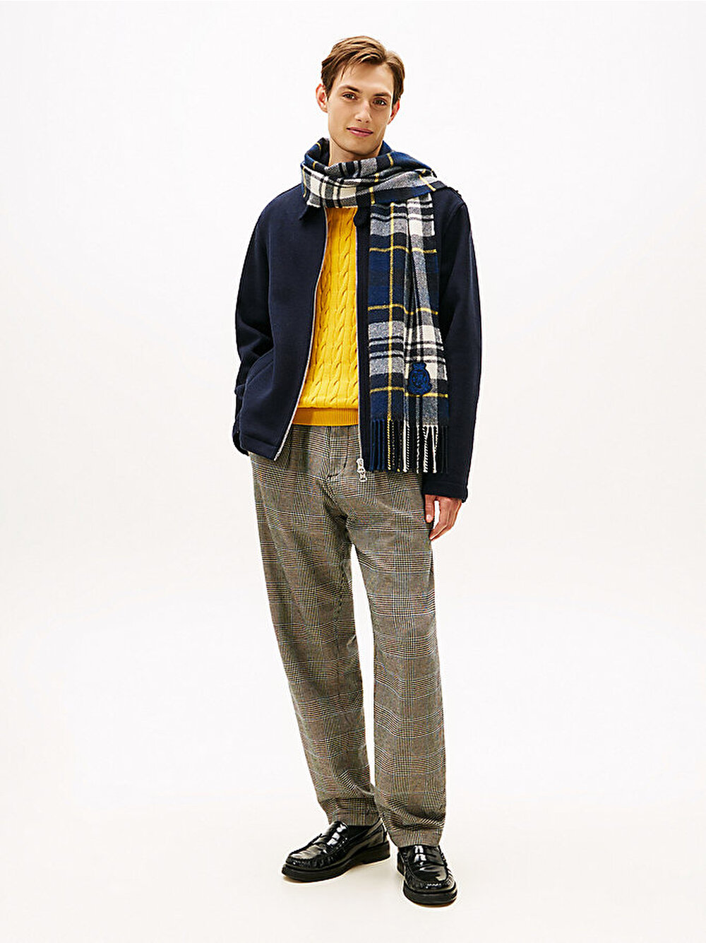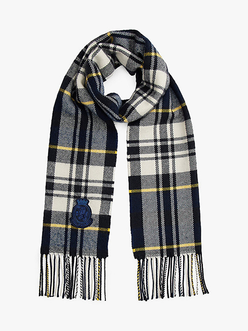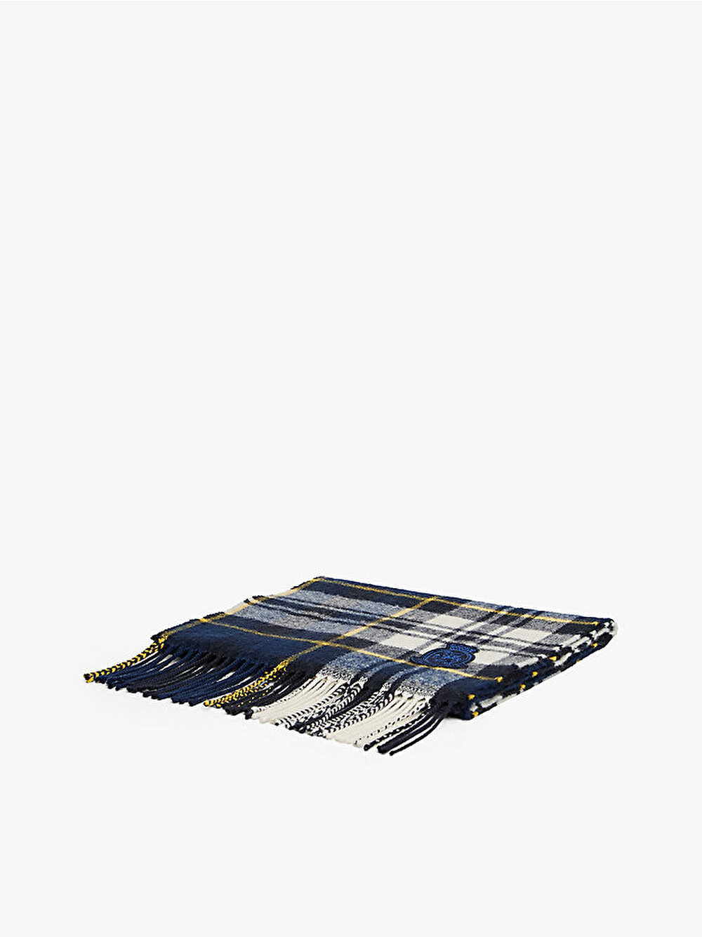 Bu klasik kareli atkı, yumuşacık yün ve az miktarda kaşmir karışımıyla üretilmiş olup, arma aplikesiyle süslenerek sofistike bir tarz sunuyor.