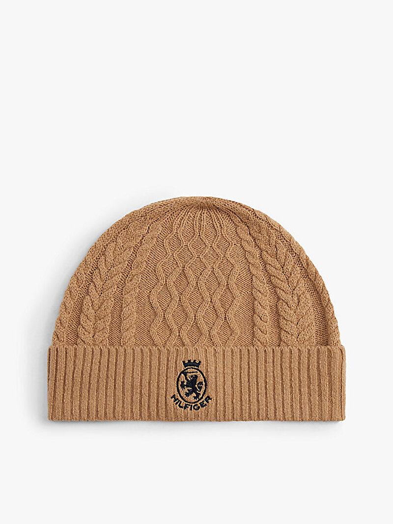 Kablo örgü tasarımı ve önündeki TH armalı nakışı, bu yün karışımlı bereye mirastan ilham alan bir tarz katıyor.
