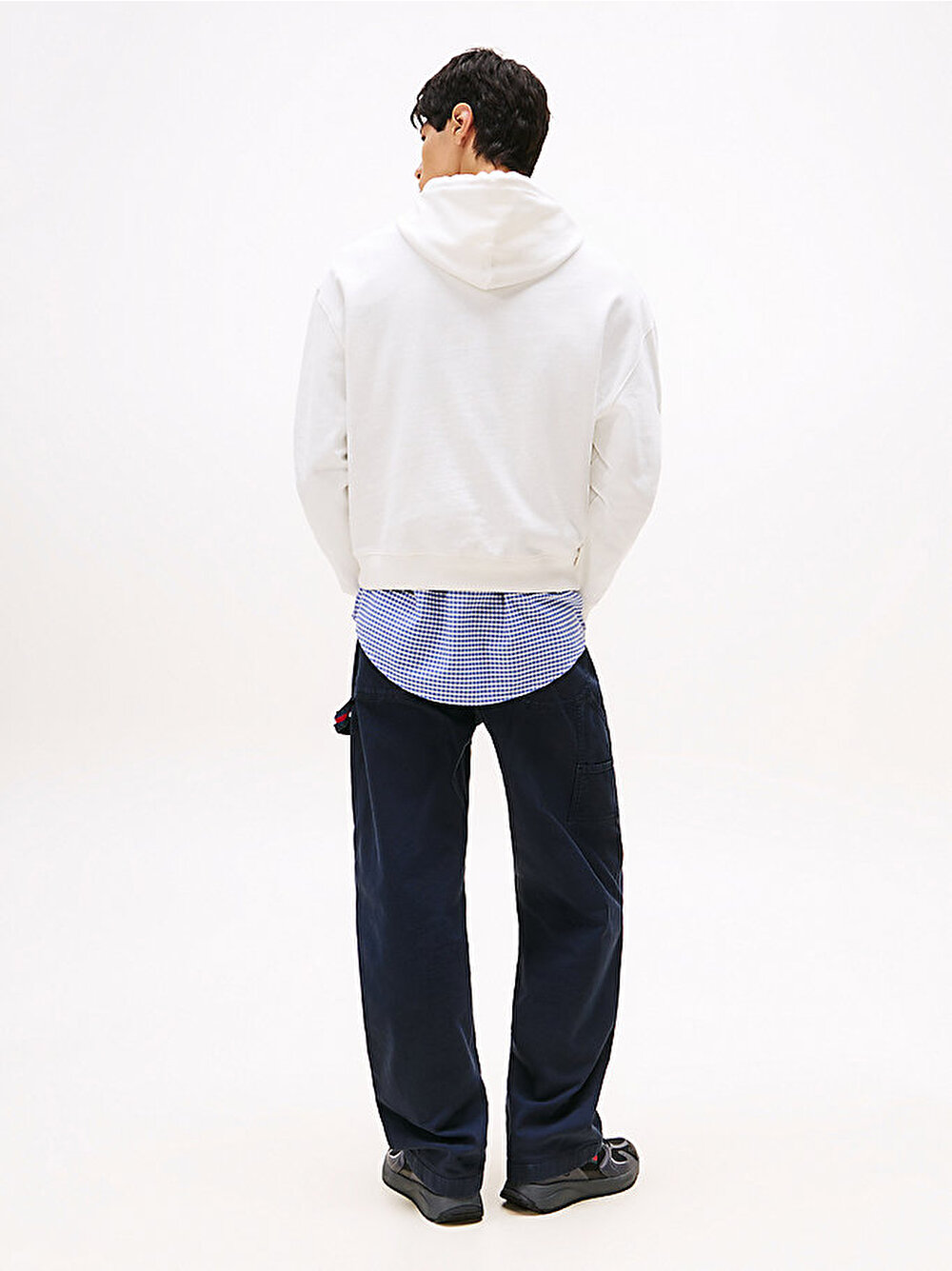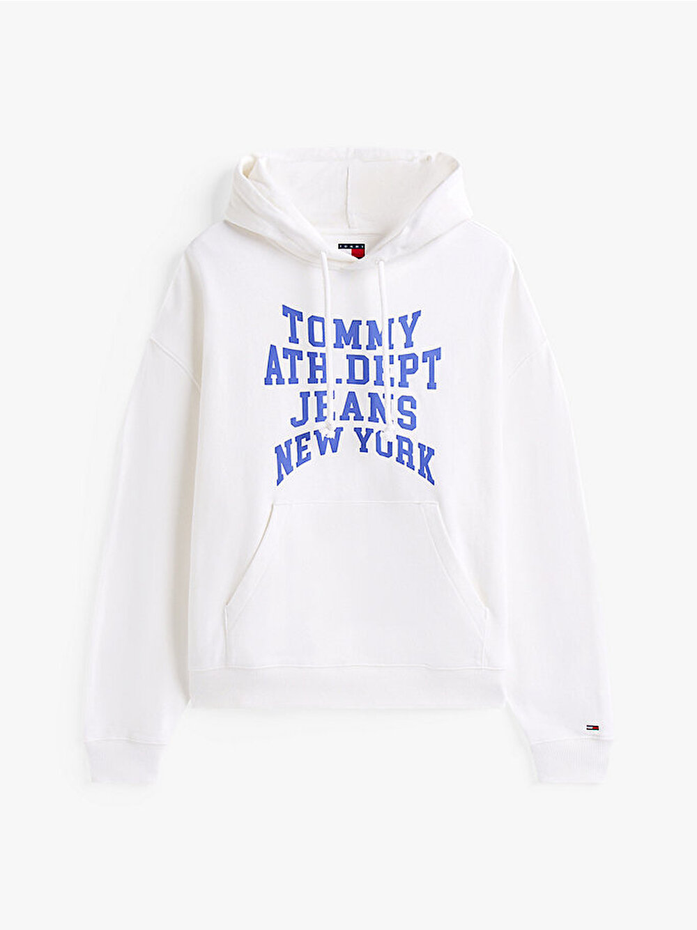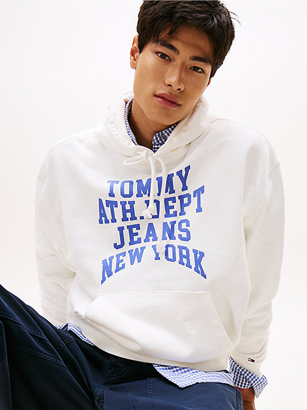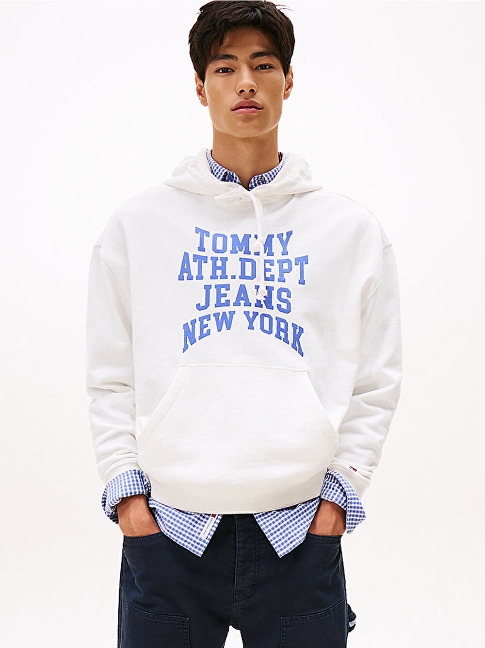 Bu kapüşonlu üst, göğüs kısmındaki üniversite tarzı logosuyla anında etki yaratırken, düşük omuzlar 90'lardan ilham alan bir figür oluşturur.