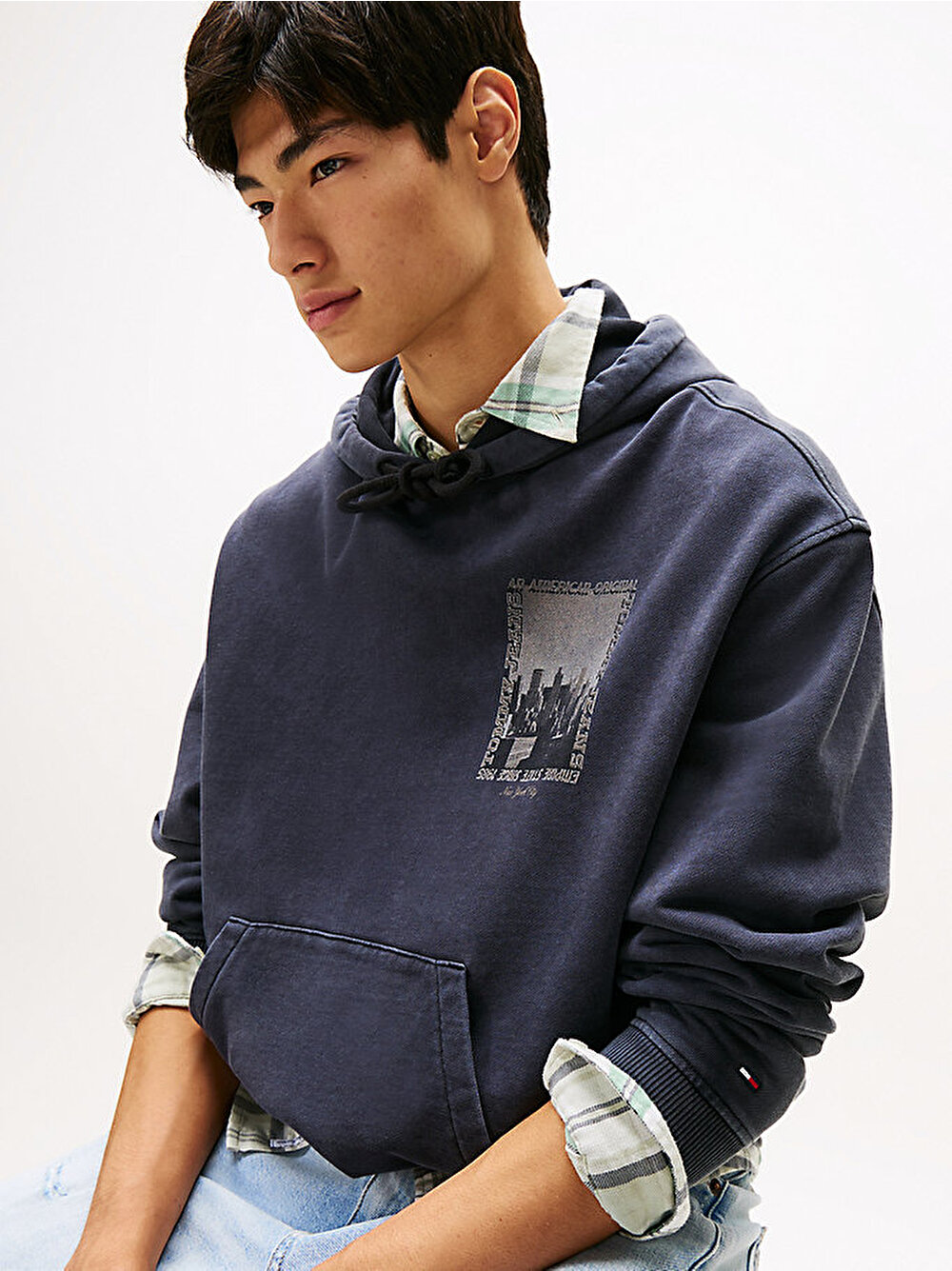 Ön ve arka kısmındaki çarpıcı şehir manzarası fotoğraf baskıları ve solmuş efektli görünümüyle bu kapüşonlu üst tam bir 90’lar havası taşıyor.