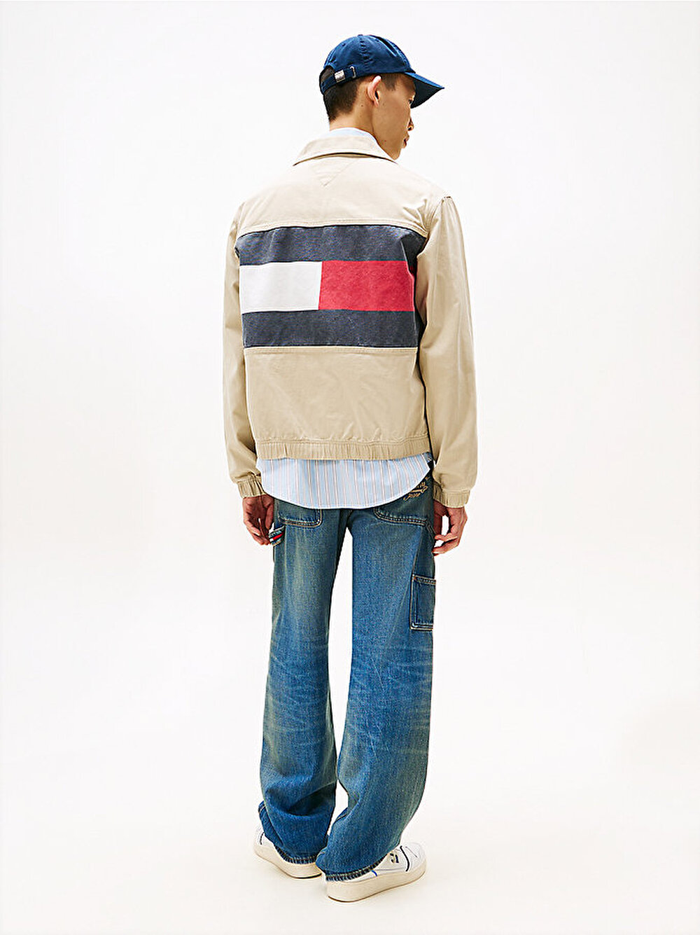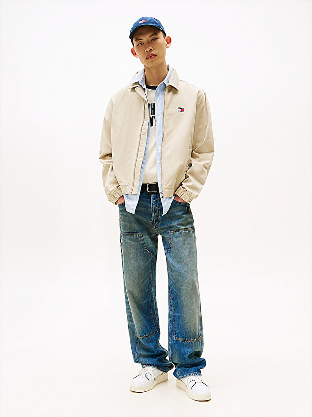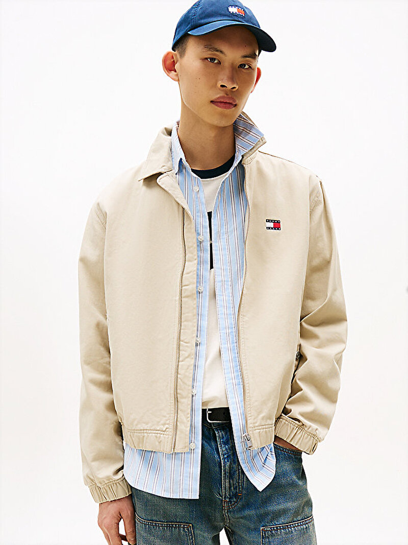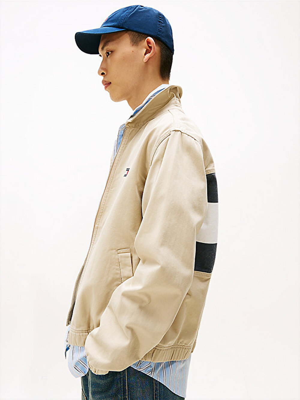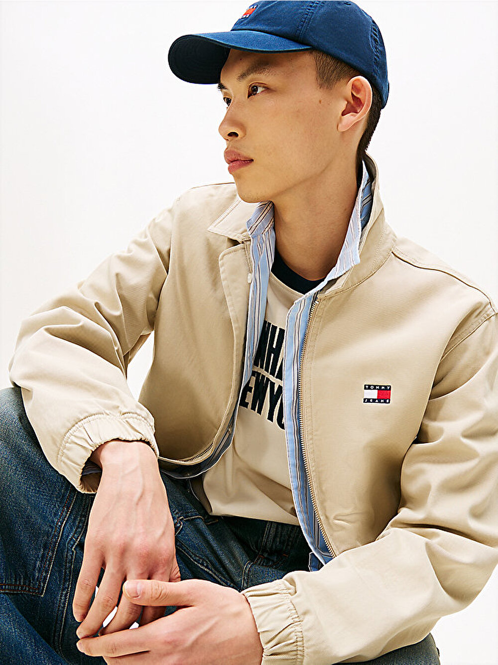 Önü fermuarlı, yarı yayvan yakalı ve klasik markalı vurgulara sahip bu normal kesim pamuklu bomber ceketle zamansız bir silueti kucaklayın.
