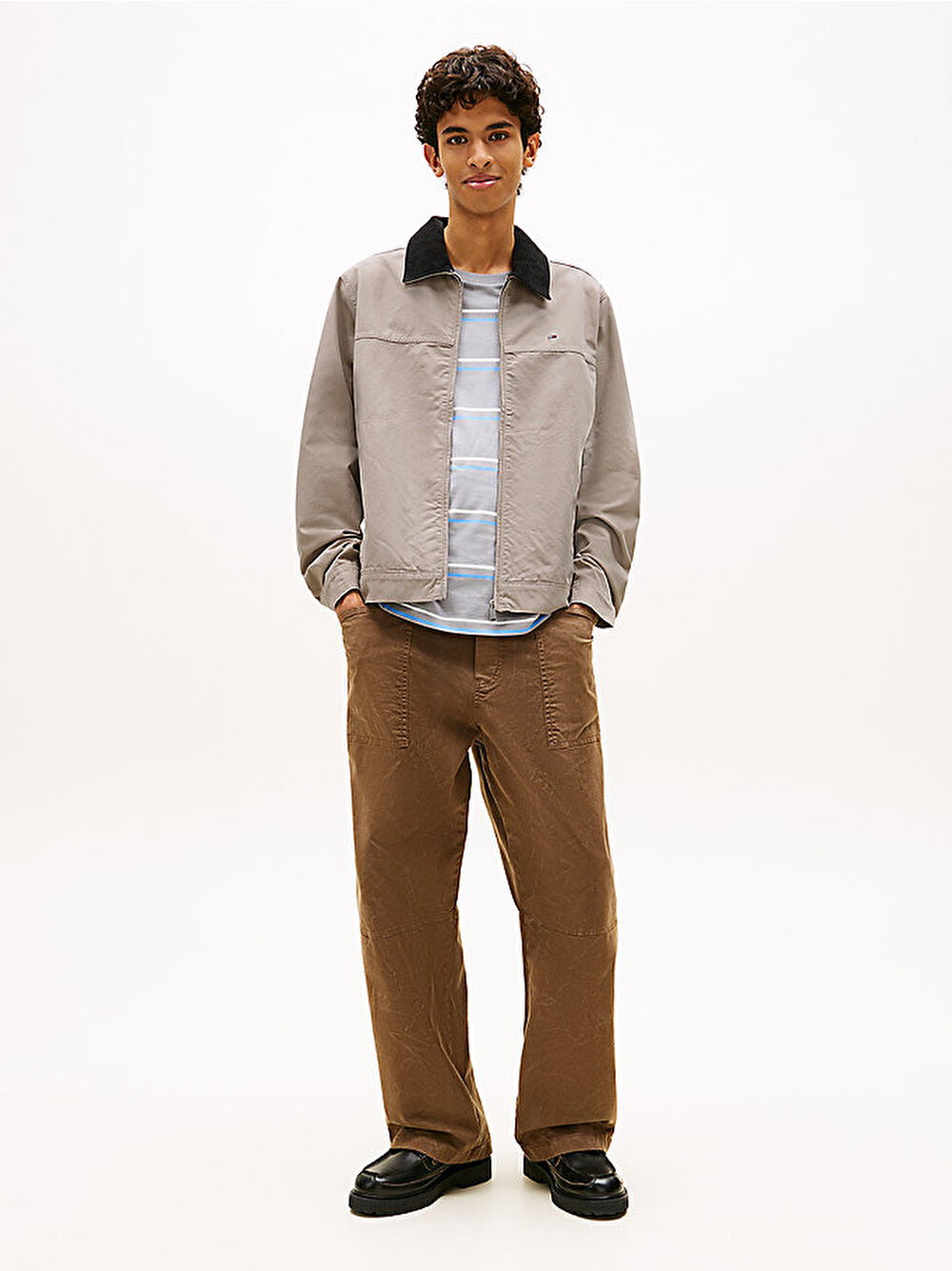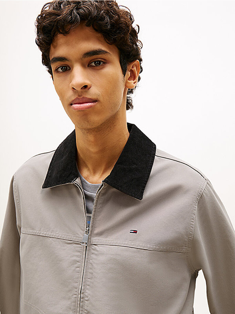 - Saf Oxford pamuktan şeftali tüyü dokulu bitişle üretilen bu trucker ceket, tam boy fermuarlı kapanışı ile çağdaş bir güncelleme kazanıyor.