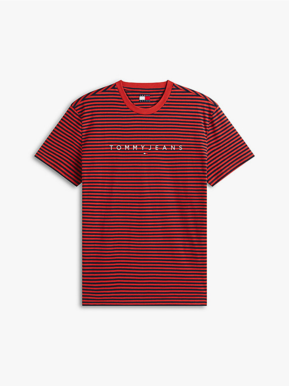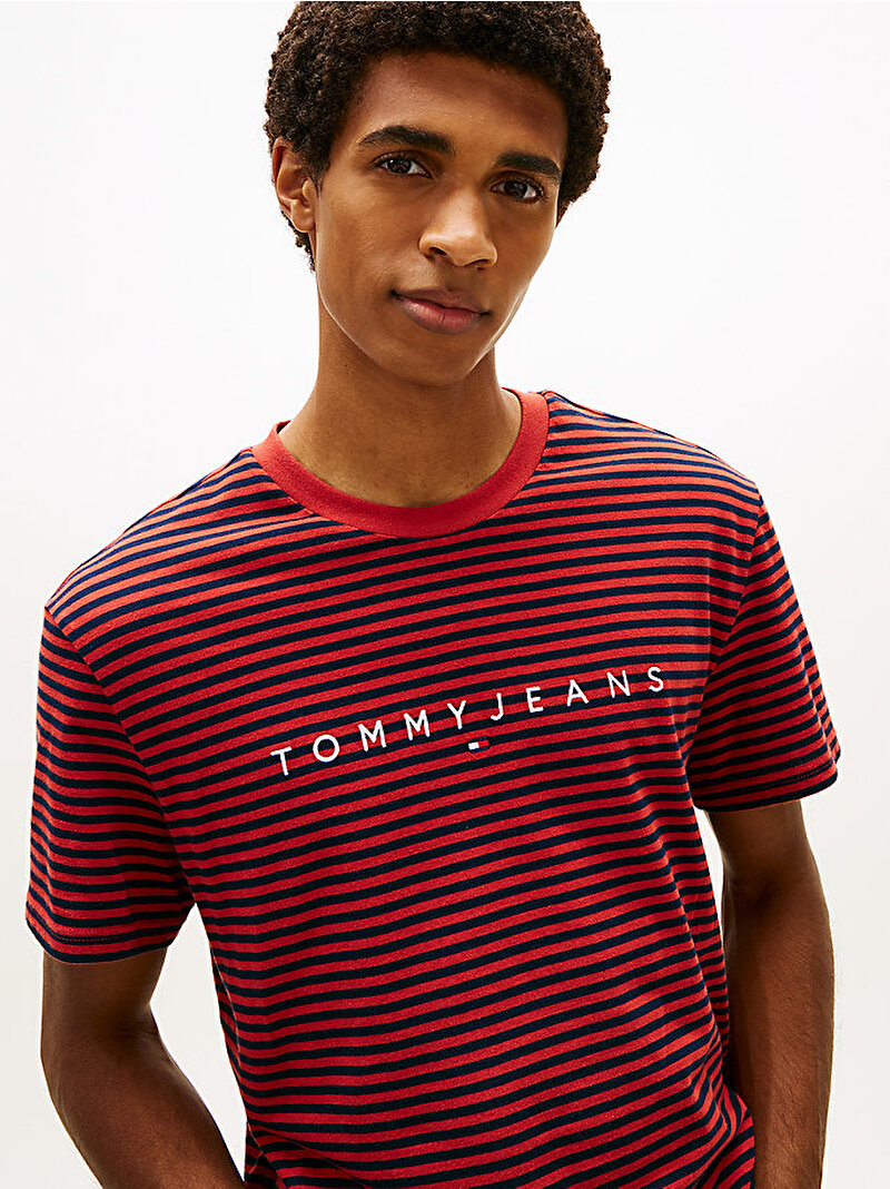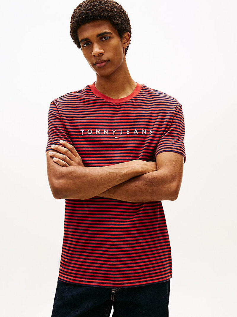 Saf pamuklu jarse bu T-shirt’ün yakası, çizgili deseniyle uyum sağlar ve minimal lineer logo ile tamamlanmıştır.