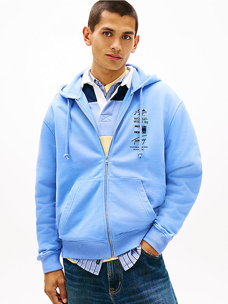 Saf şeftali apreli pamuklu terry kumaştan üretilen bu fermuarlı kapüşonlu sweatshirt, ön ve arka kısmında outdoor esintili marka logosu ile hafta sonu stilini tamamlıyor.