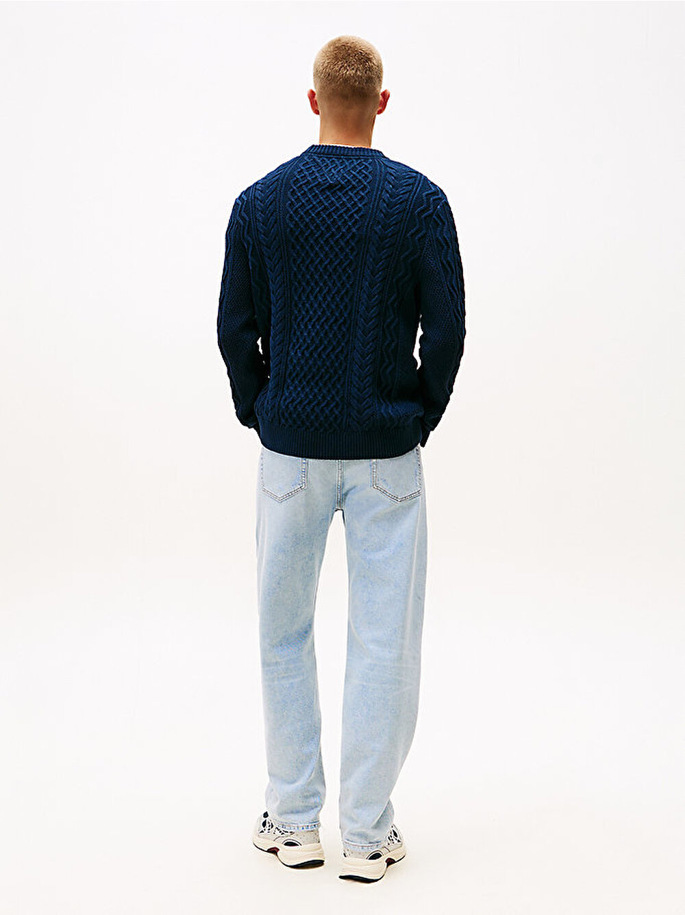 Bu kazak, hem çarpıcı hem de zamansız bir görünüm için slim-fit kesimi klasik kablo örgü tasarımıyla birleştiriyor.