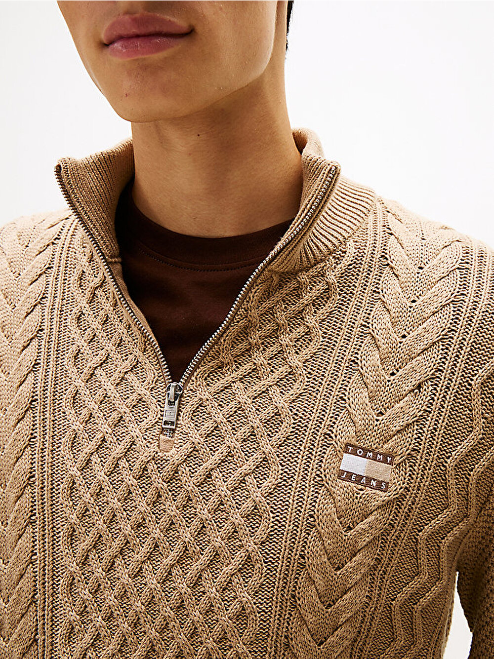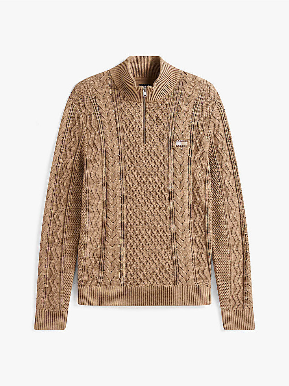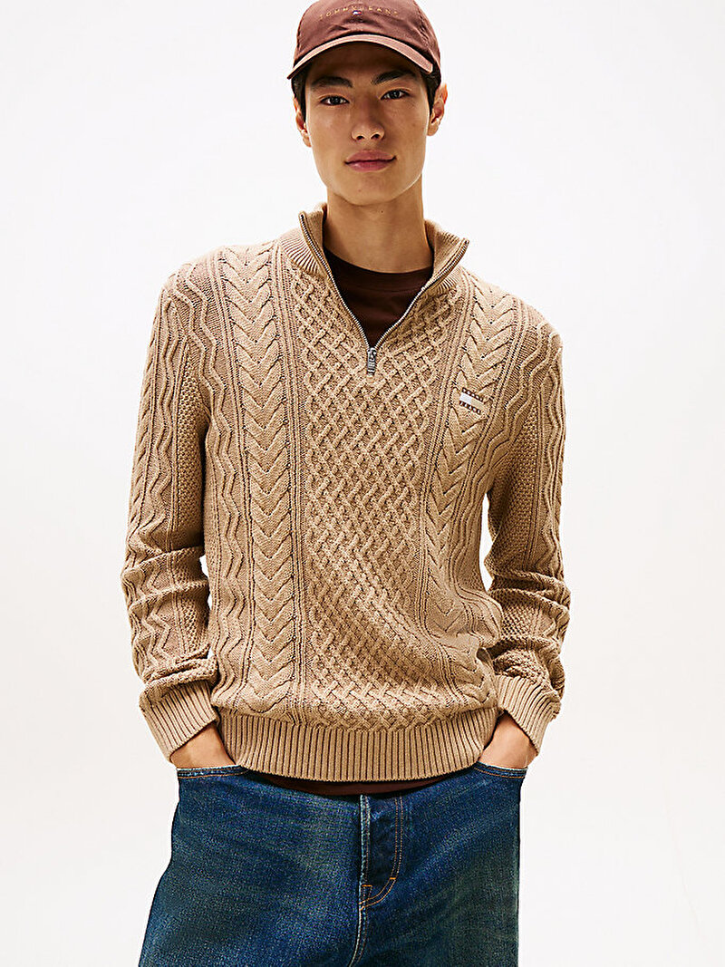 Çeyrek fermuarlı yaka tasarımlı bu kablo örgülü kazak mirastan ilham alan estetiğine modern ve sportif bir hava katıyor.