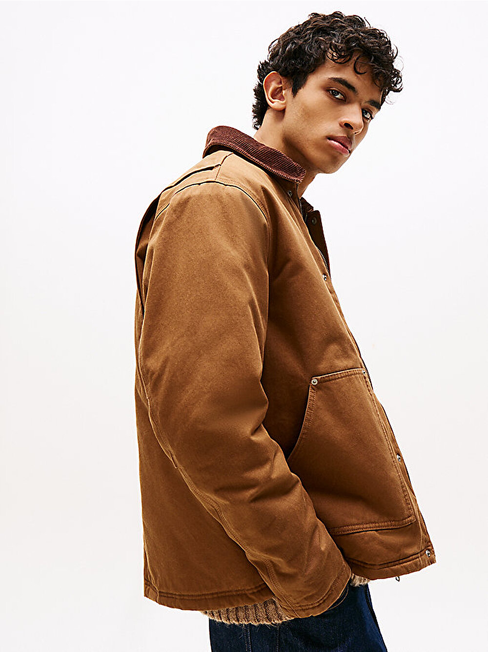 Bu saf pamuklu dimi ceket, chore ceket esintili tasarımını dolgulu peluş astarla tamamlayarak geleneksel bir soğuk hava parçası oluşturur.