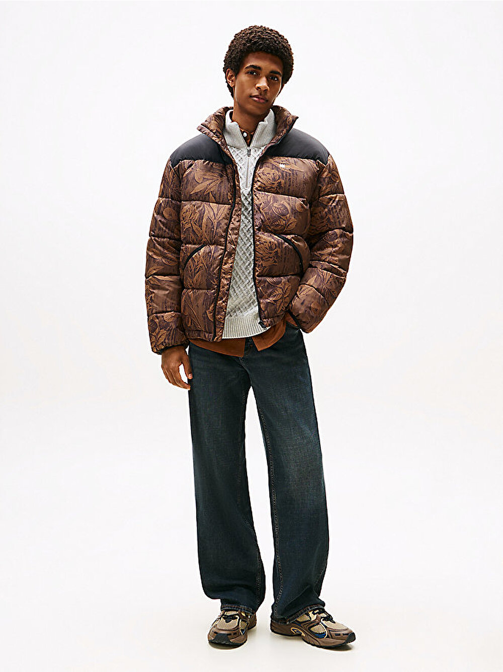 Bu şişme mont, tonal çiçek desenini suya dayanıklı ripstop yüzeyle bir araya getirerek dikkat çekici bir dış giyim görünümü yaratıyor.