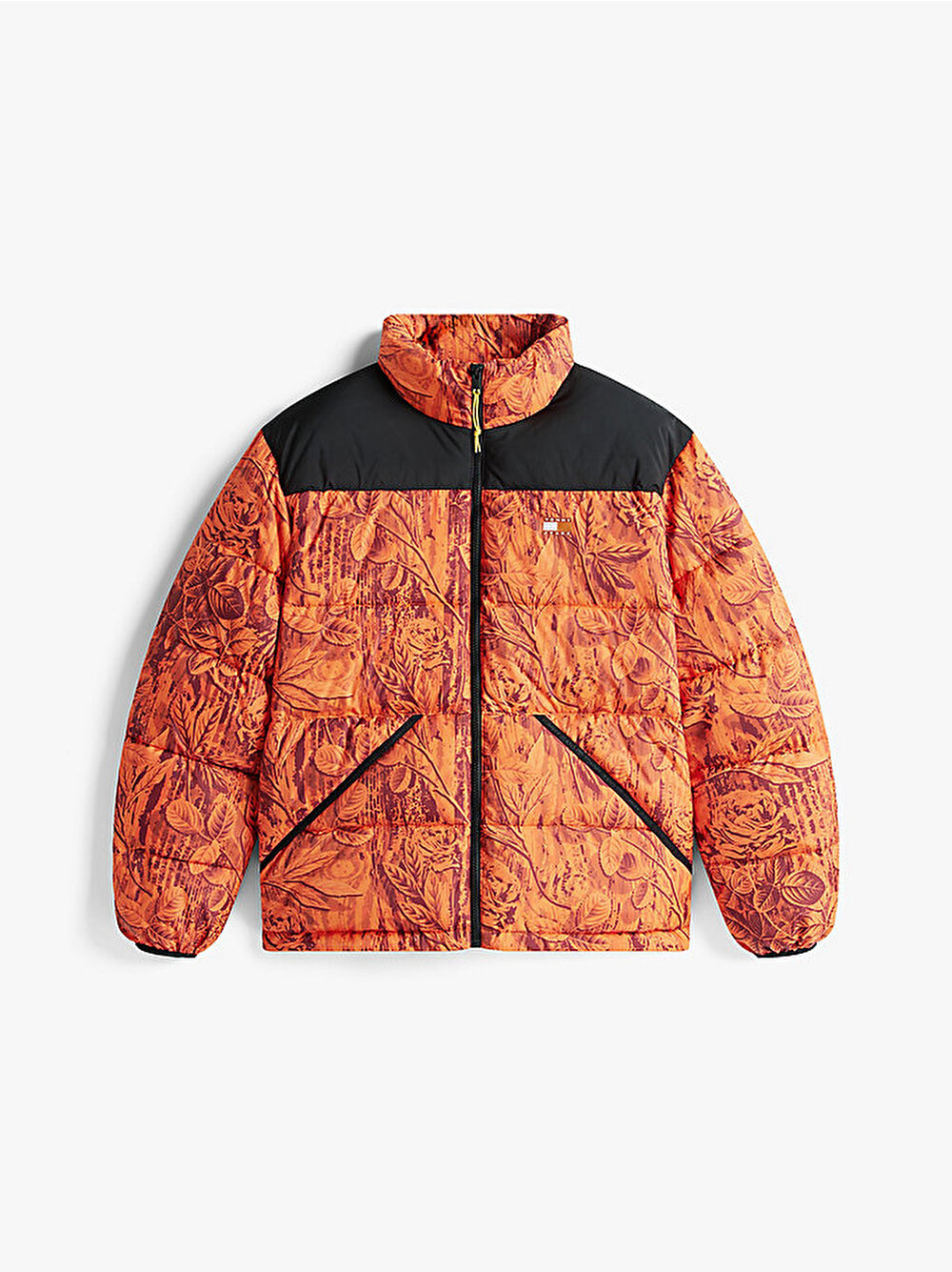Bu şişme mont, tonal çiçek desenini suya dayanıklı ripstop yüzeyle bir araya getirerek dikkat çekici bir dış giyim görünümü yaratıyor.