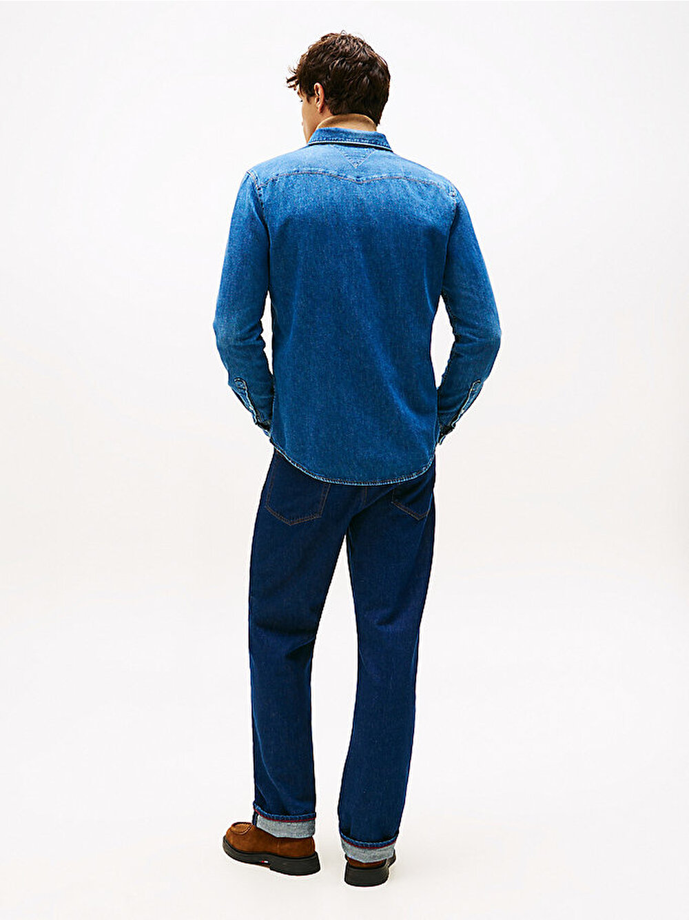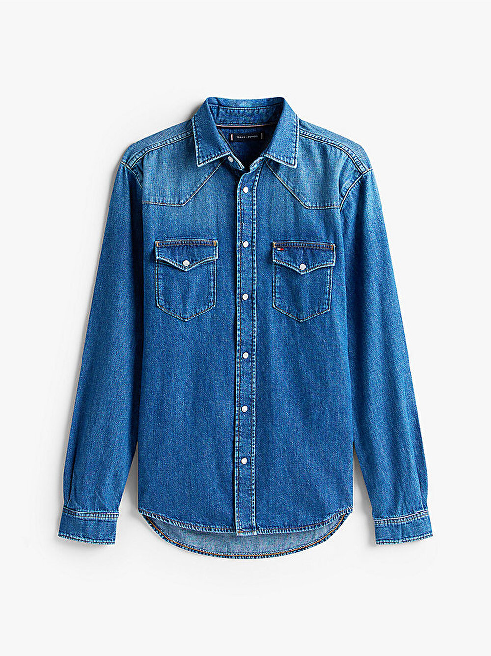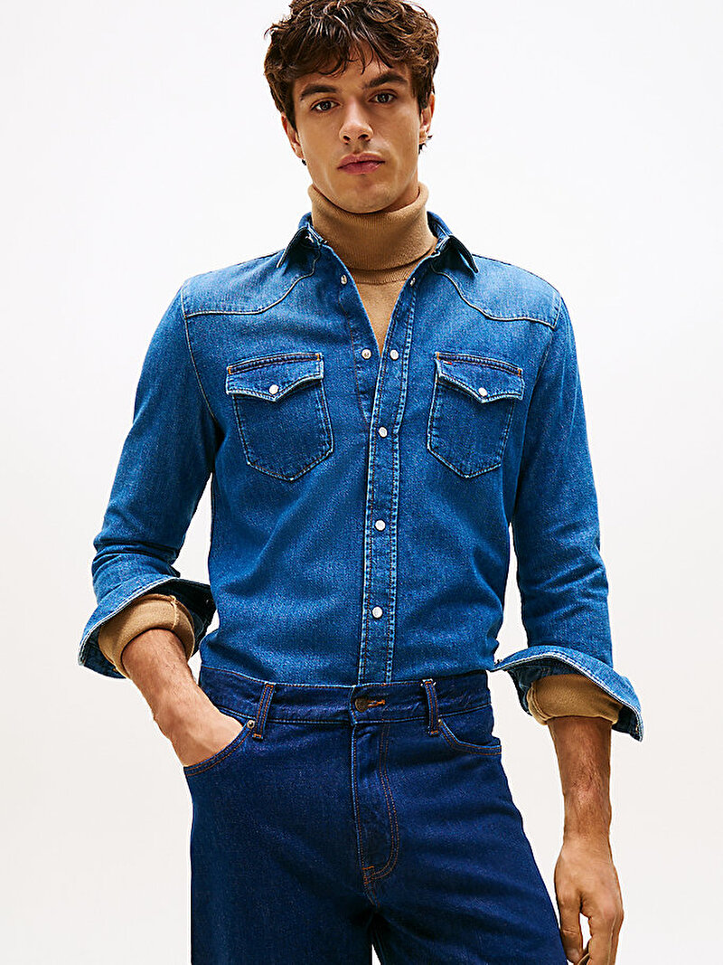 Kontrast dikişler, eskitilmiş dikiş hatları ve sedef görünümlü çıtçıtlarla tamamlanan bu Western denim gömlekle otantik Amerikan stilini yansıtın.