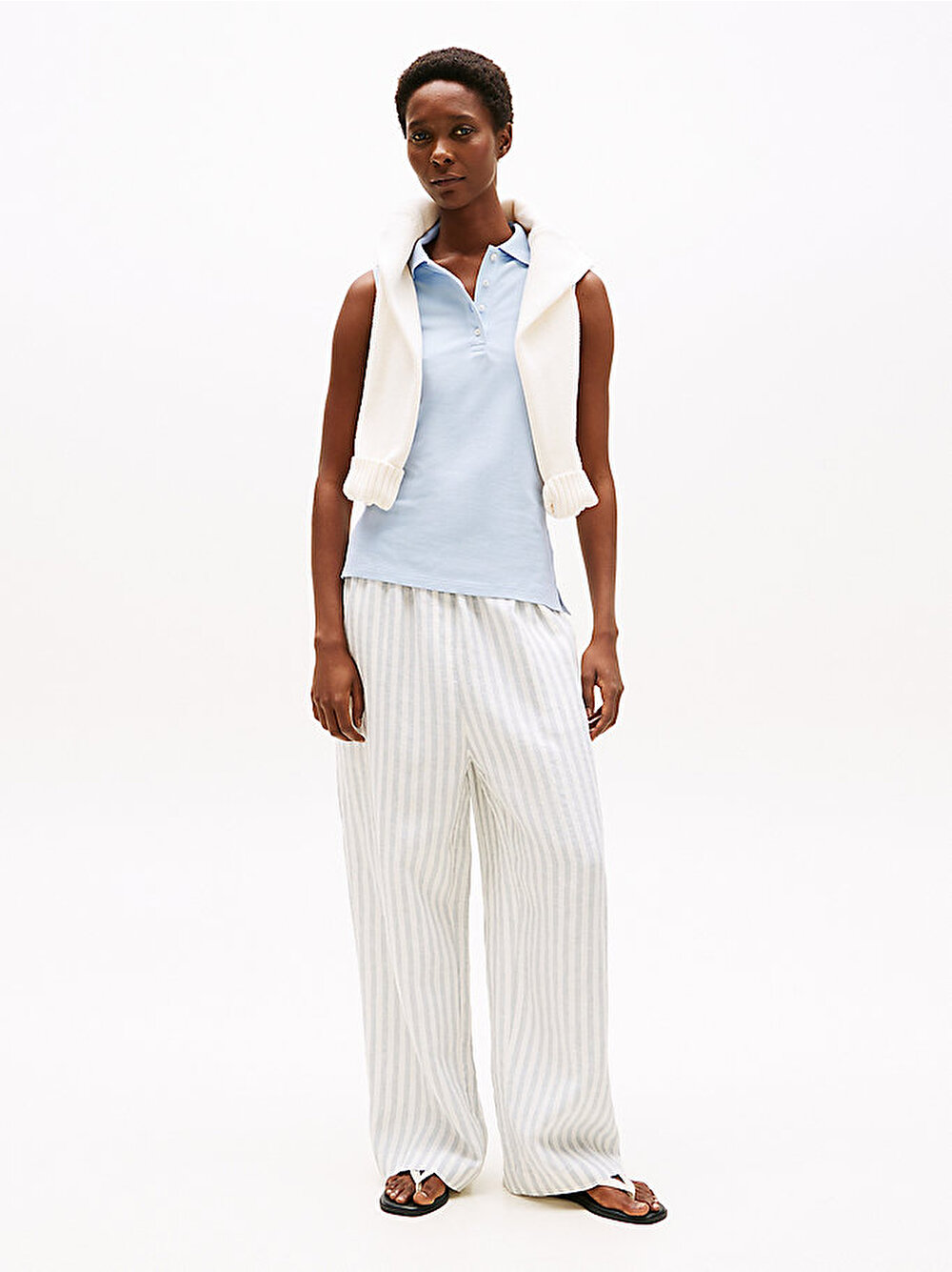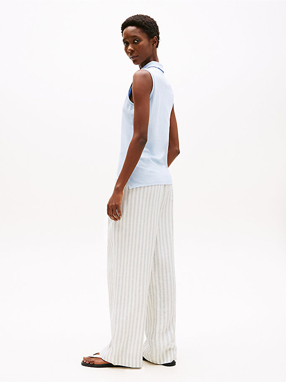 Slim fit kesimi ve kolsuz tasarımı bu polo tişörte feminen dokunuşlar getirirken, streç pamuklu kumaş rahat bir his sağlıyor.