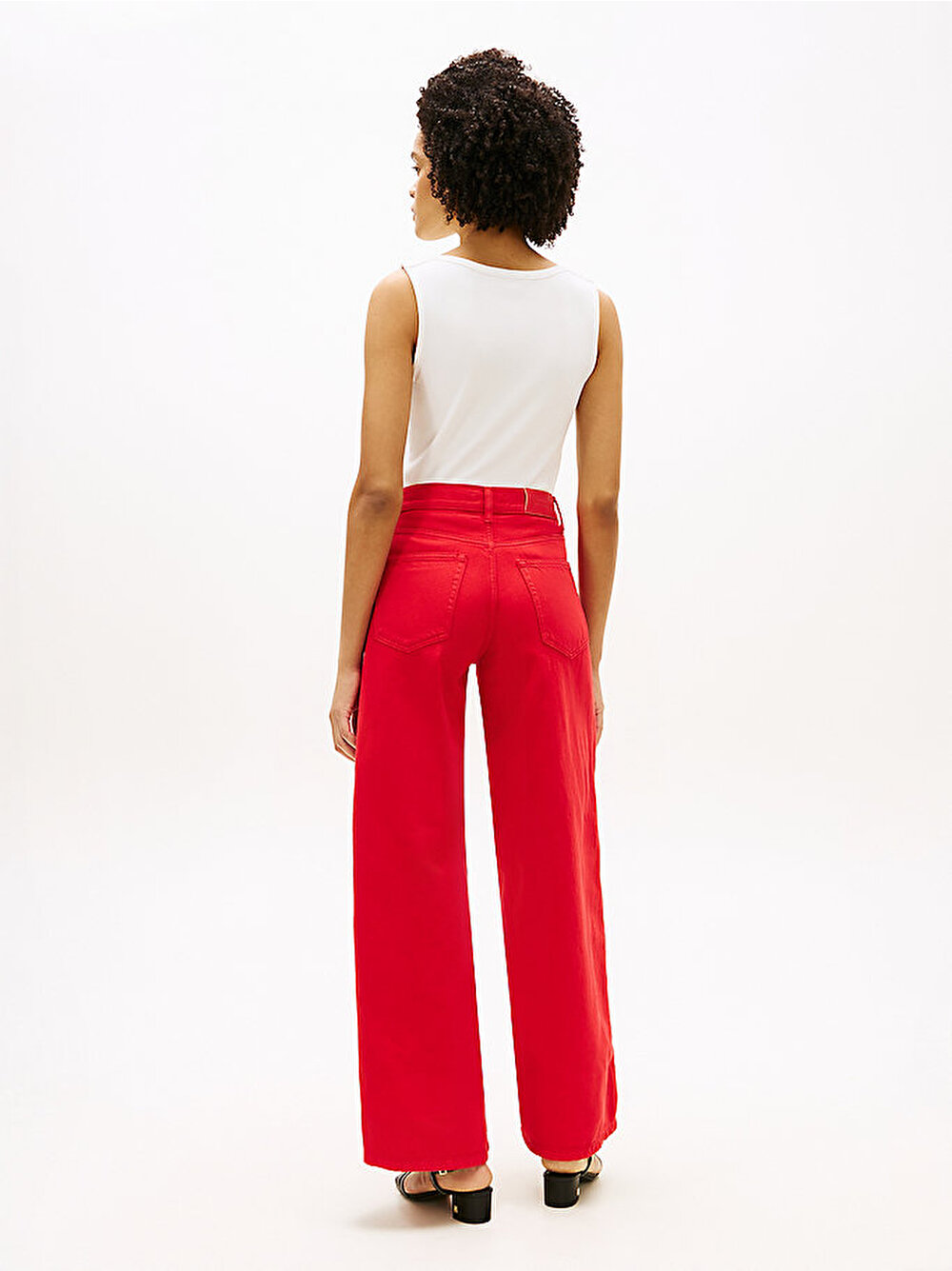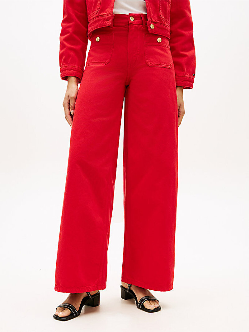 Parlak düğme detaylarıyla zenginleşen şık, wide leg silüeti ve iddialı yüksek beliyle, bu sert denim jean pantolonda 70'ler havasını yakalayın.