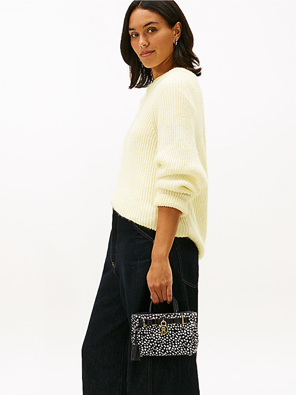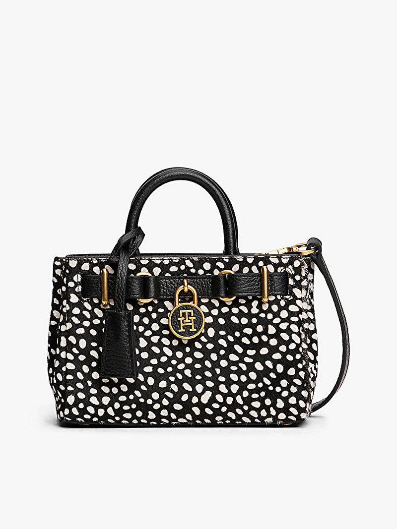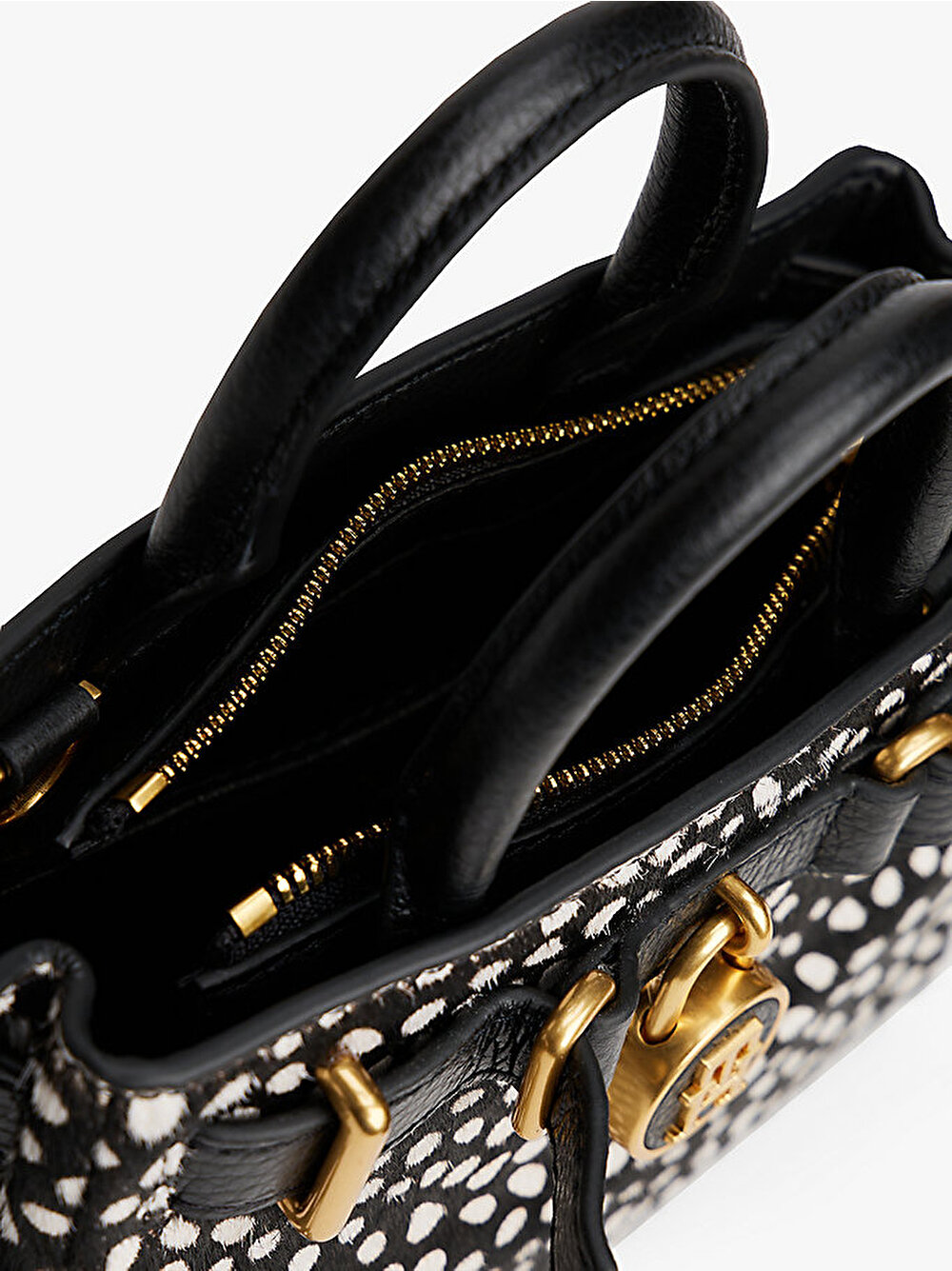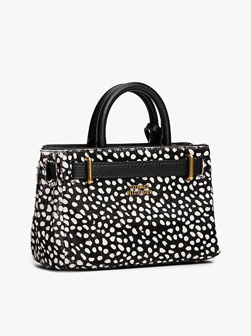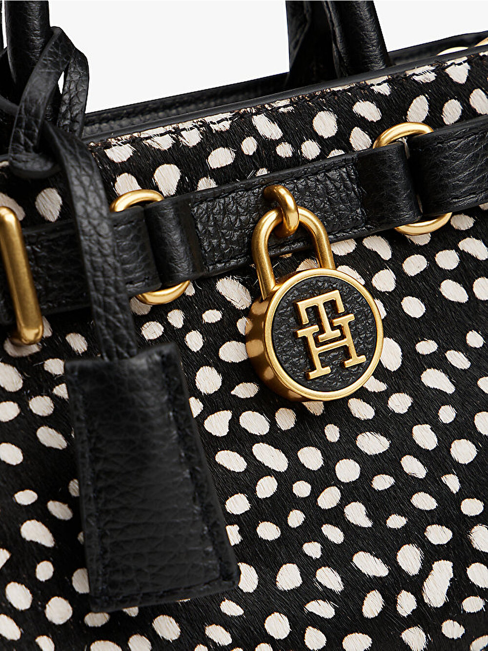 Deri tasarımı, çarpıcı geyik baskısı ve güçlü metal donanımıyla bu kompakt tote çanta, gün boyu ve geceye uzanan görünümler için ideal bir aksesuar sunar.