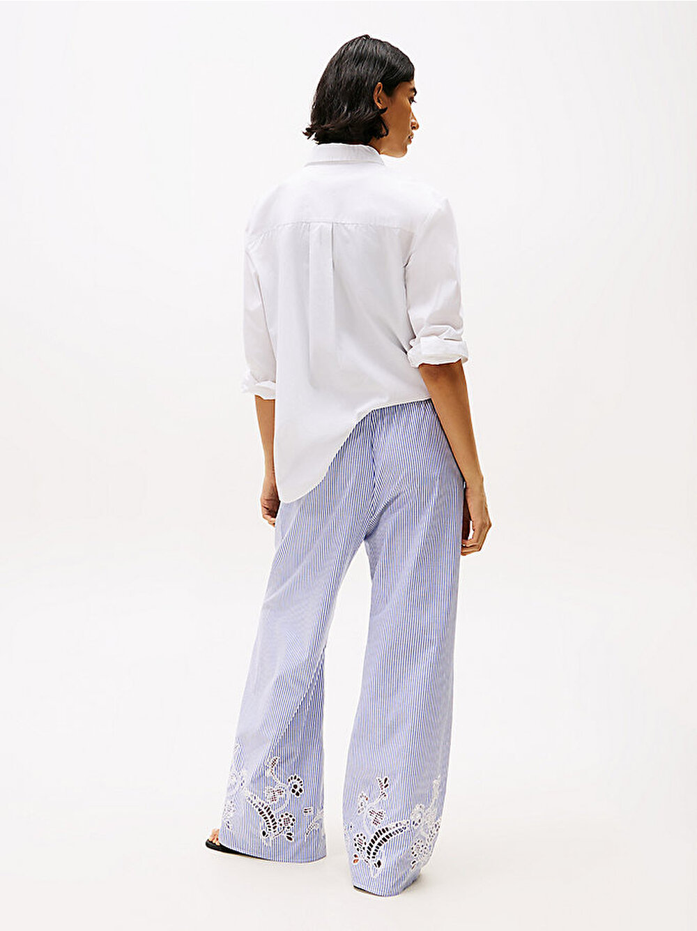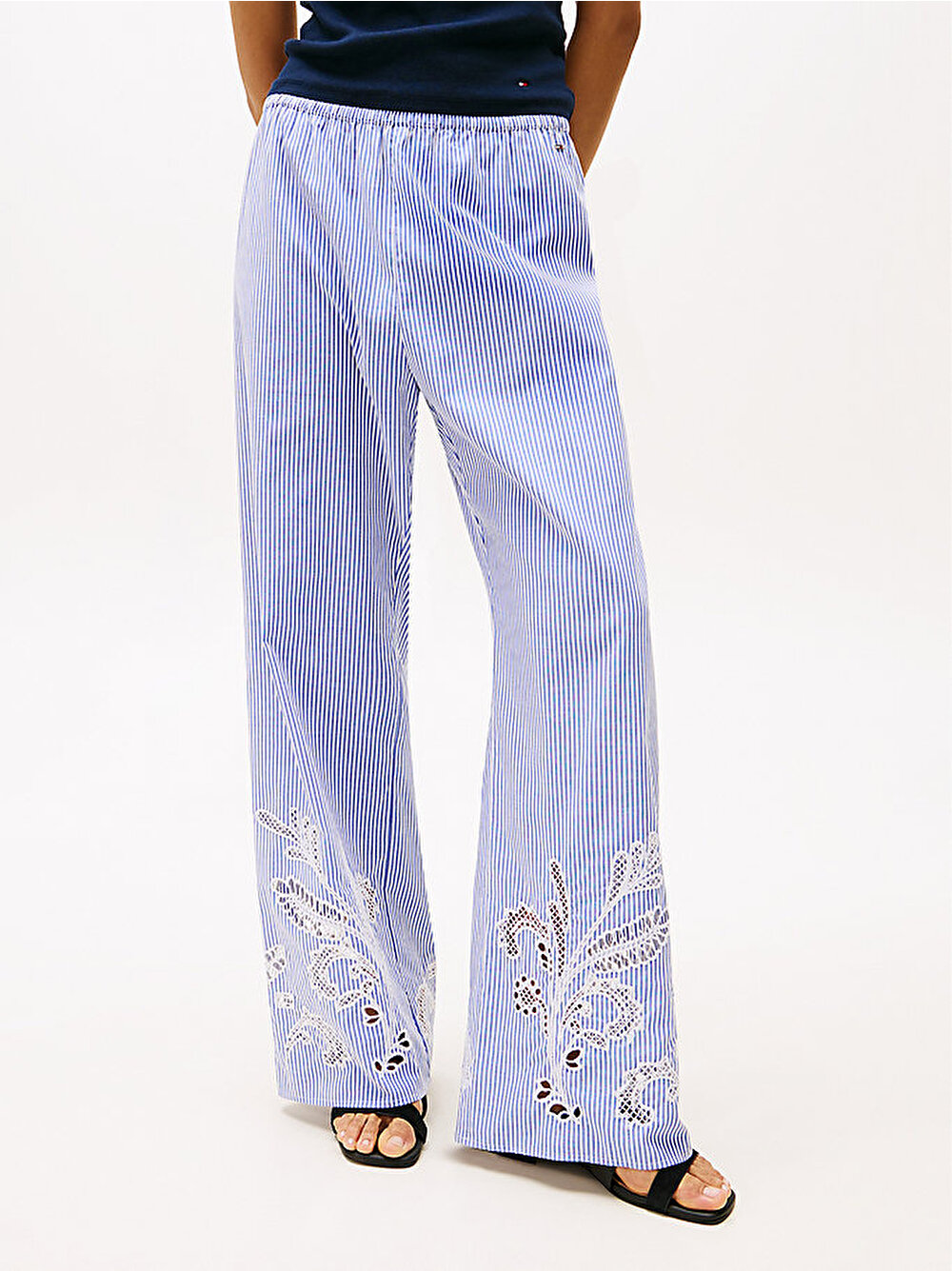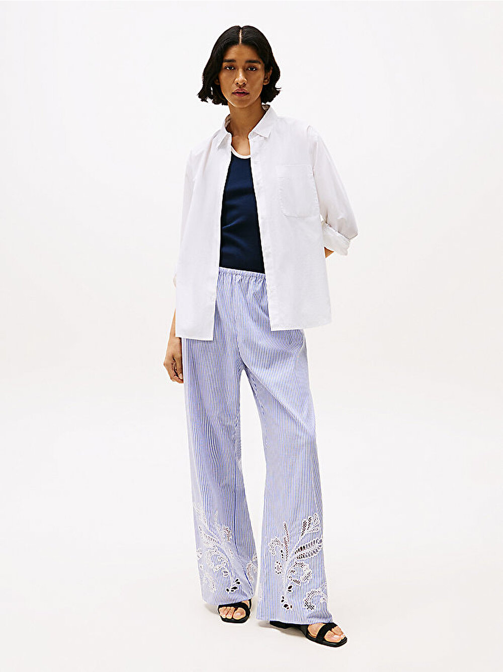 Zarif çizgiler ve brode anglez detaylarla süslenmiş bu saf pamuk pantolon, yaz aylarındaki özel etkinlikler için idealdir.