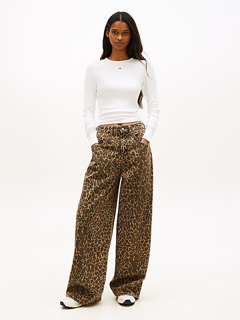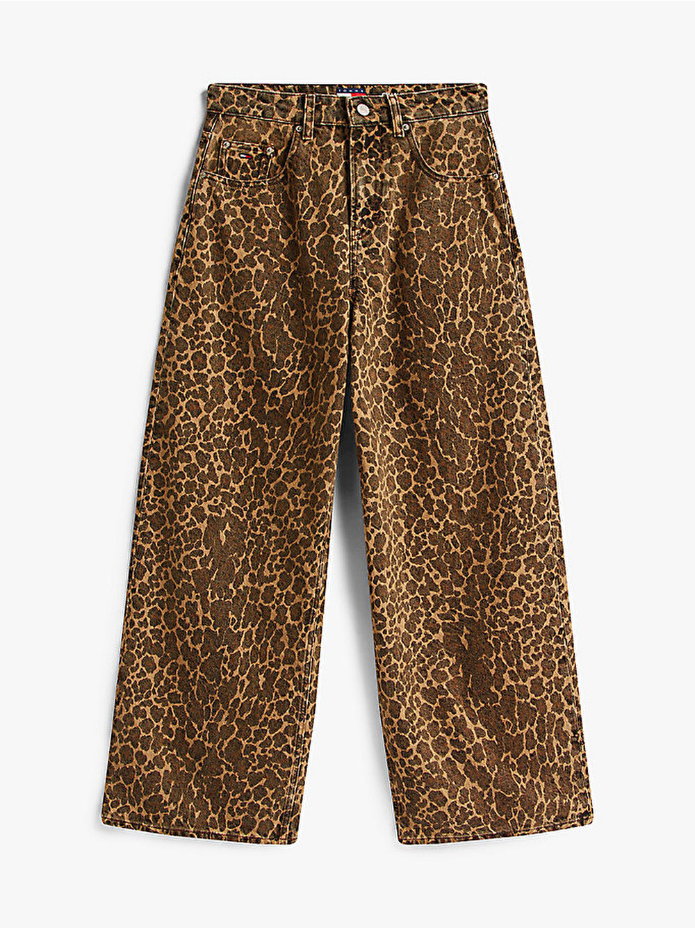 Dökümlü wide leg kesimi ve mid rise beli ile öne çıkan Leopar desenli bu bol kesim jean pantolon ile iddialı bir stil yaratın.