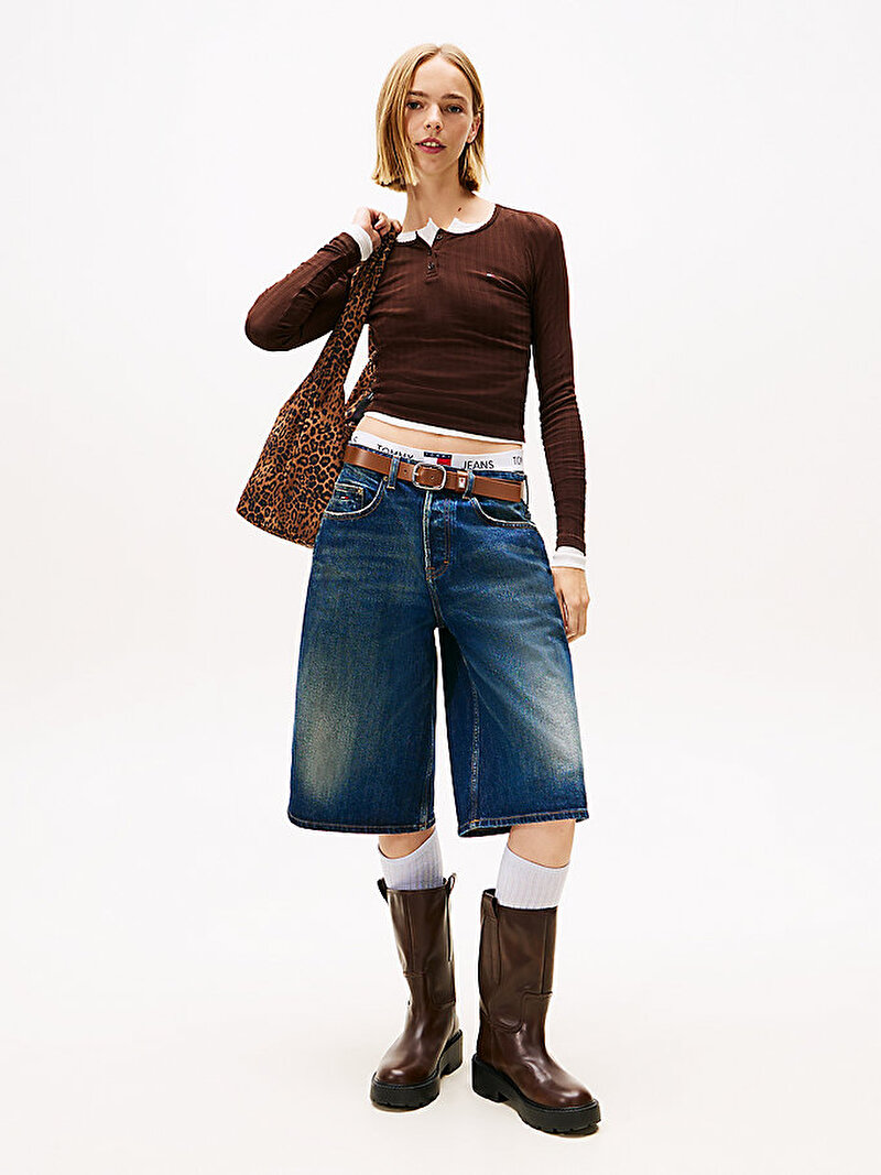 Bu wide-leg denim şort, rahat bol kesimiyle öne çıkar; soluk efekt, eskitme ve bıyık detaylarıyla yaşanmış bir görünüm sunar.