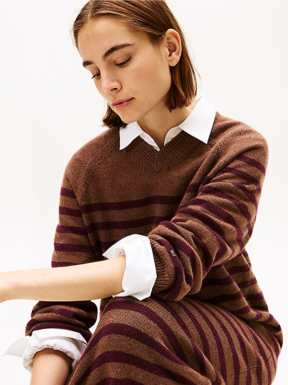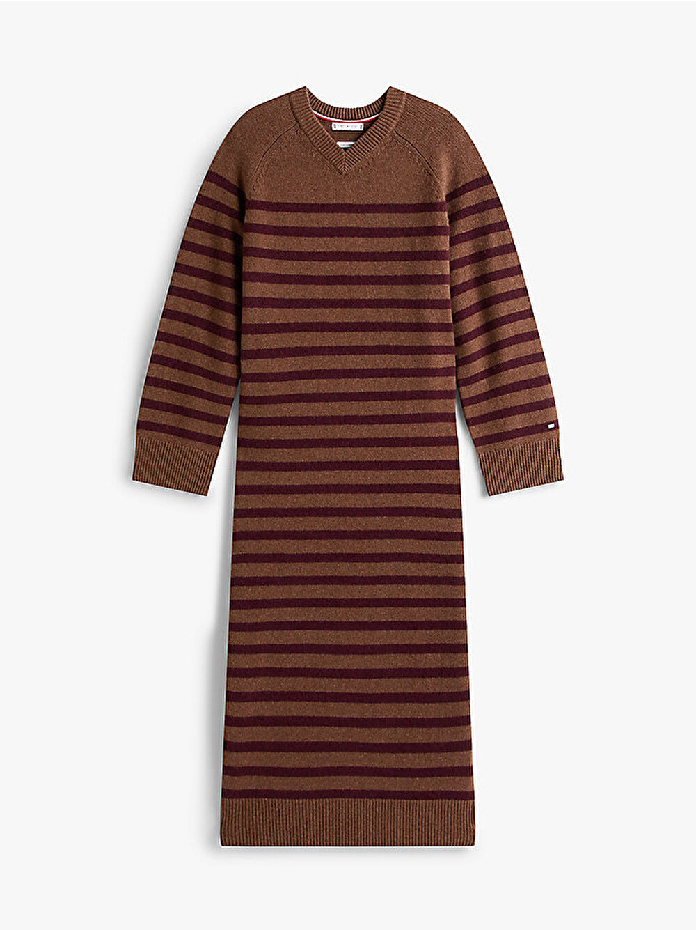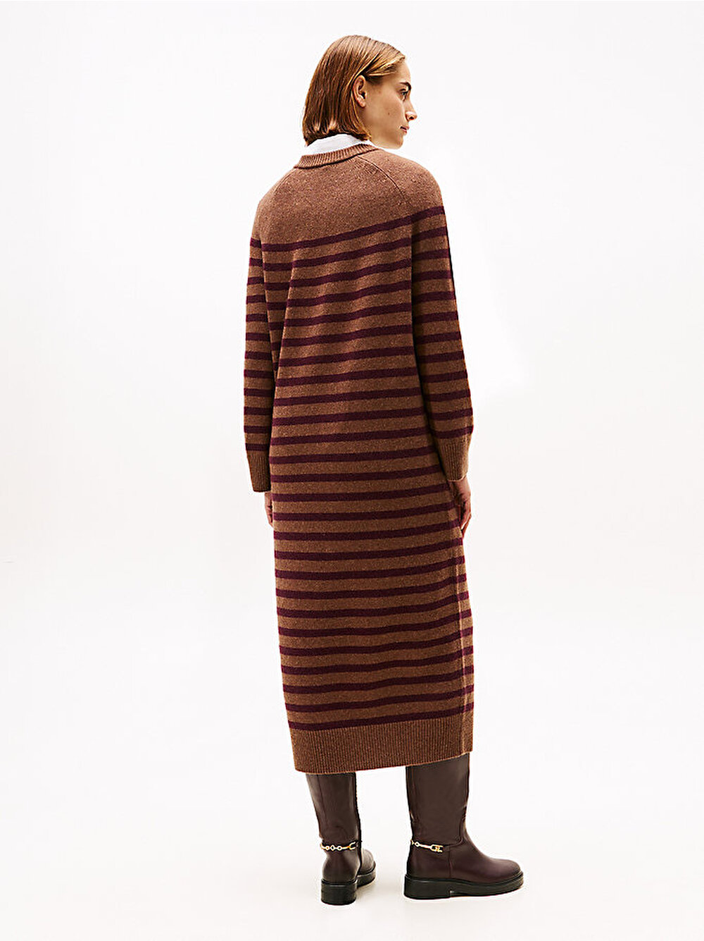 Bu çizgili midi kazak elbise, lüks yün ve kaşmir karışımı iplikten zahmetsiz ve rahat bir kesimle örülmüştür.