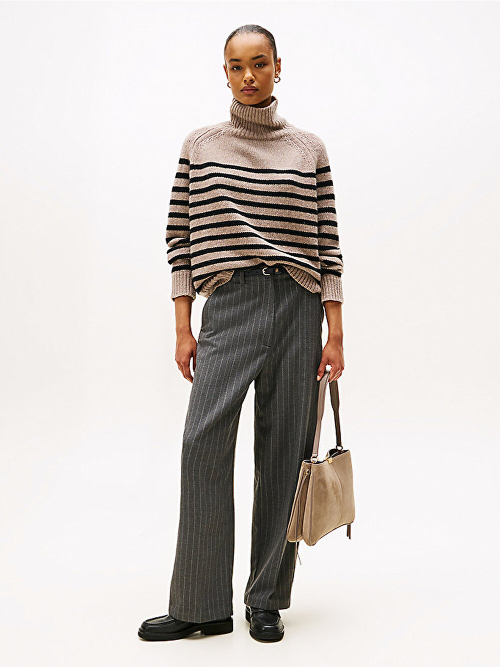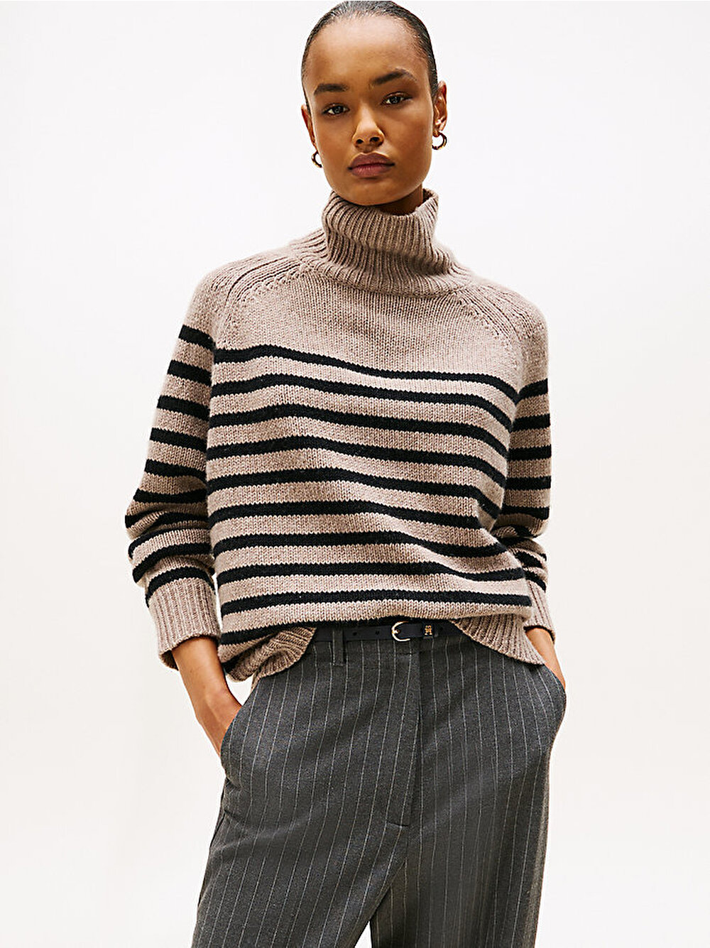 Sıcacık yünün ve yumuşacık kaşmirin görkemli karışımından örülen bu premium boğazlı kazak, kolay ve rahat bir kesime sahip.