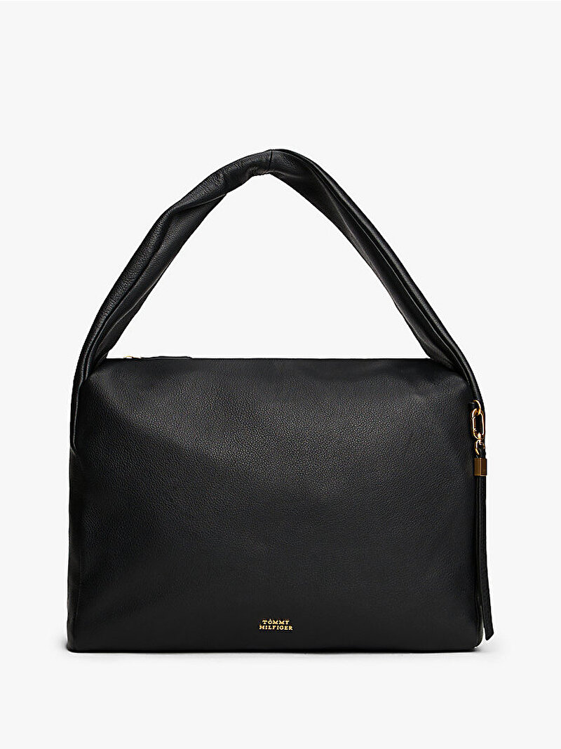 Çakıl taneli deri yüzeye sahip bu hobo çanta, parlak logo plakasıyla vurgulanan salaş tasarımıyla dikkat çekiyor.