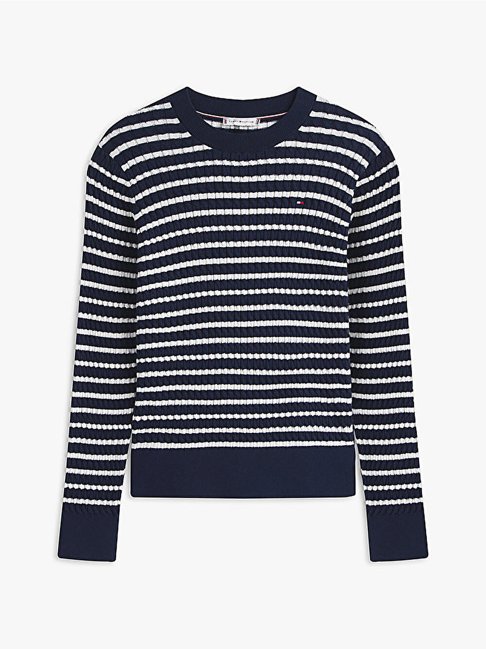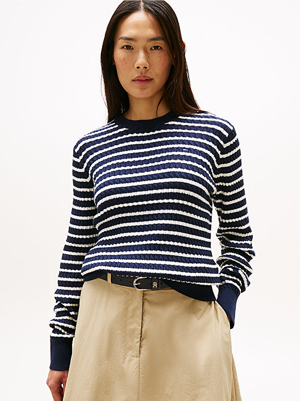 Zamansız kablo örgü tasarımı ve bisiklet yaka siluetiyle bu saf pamuklu kazak, geçiş mevsimi stilleri için mükemmel, rahat ve hafif bir katman.