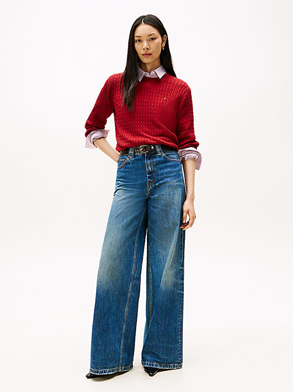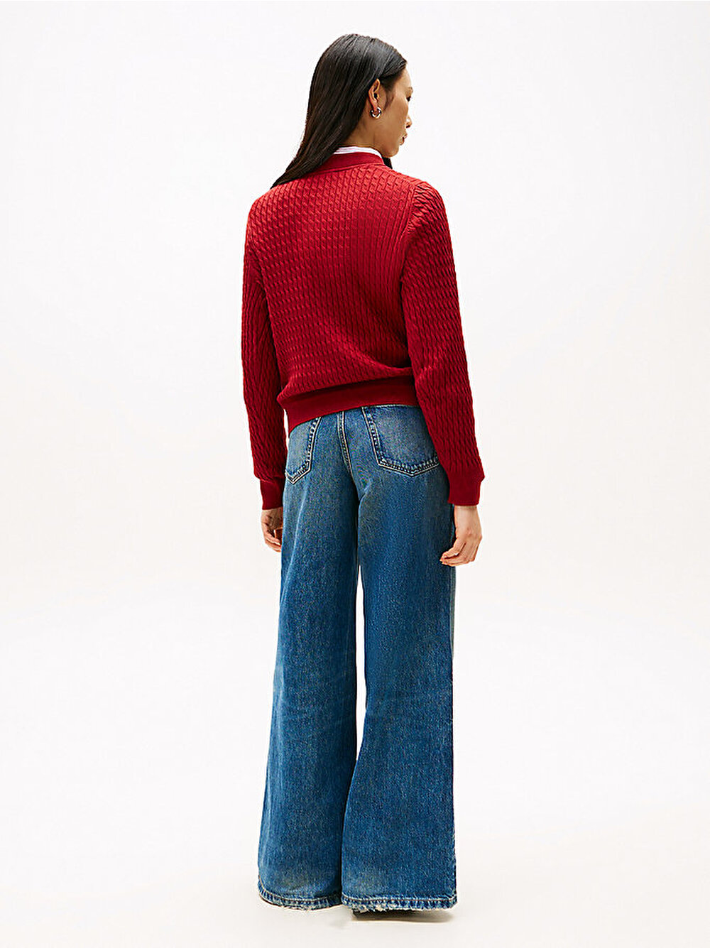 Zamansız kablo örgü tasarımı ve bisiklet yaka siluetiyle bu saf pamuklu kazak, geçiş mevsimi stilleri için mükemmel, rahat ve hafif bir katman.