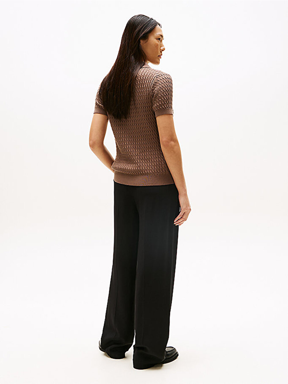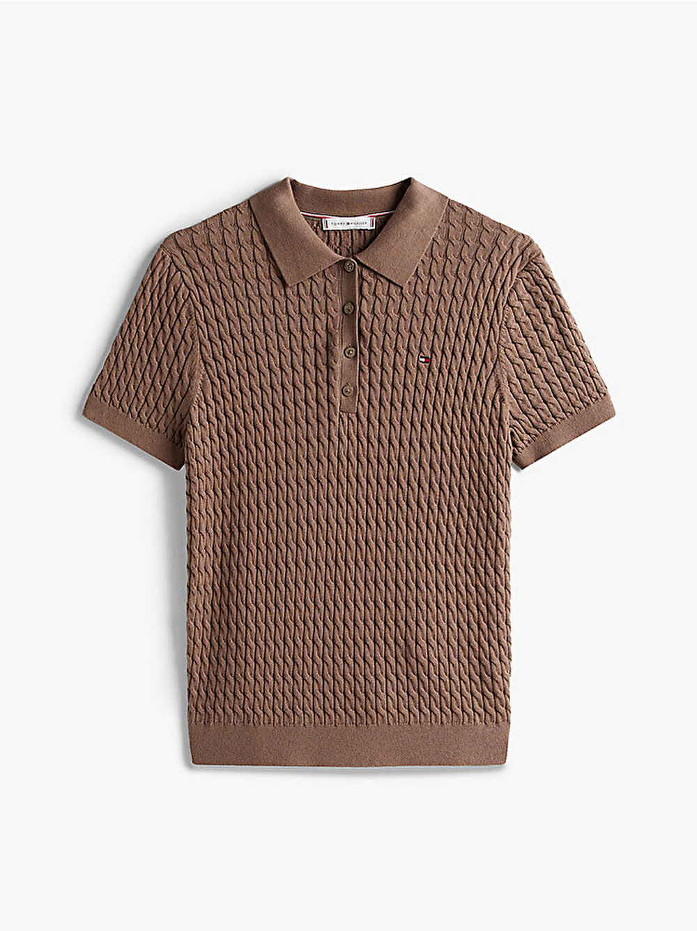 Bu kısa kollu kazak, sportif polo yakası ve ince örgü kablo desenleriyle mevsim geçişlerine uygun hafif bir katman alternatifi sunar.