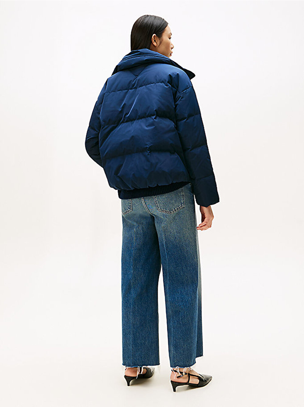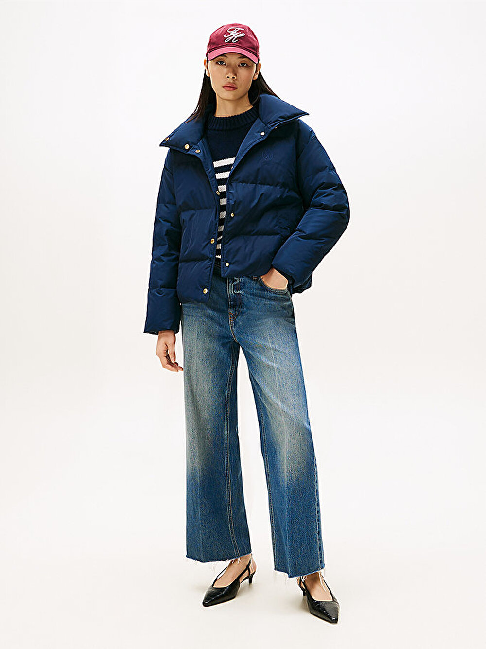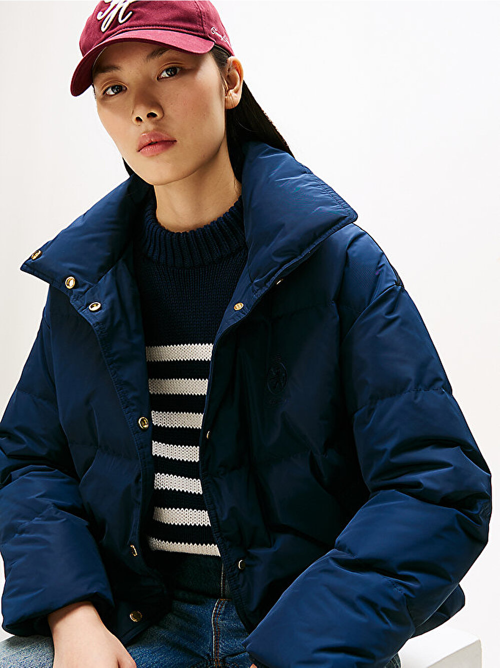 Bu şişme mont, kalın kaz tüyü dolgusu ve su itici yüzeyi ile çiseleyen günlerde sizi sıcak ve kuru tutar.