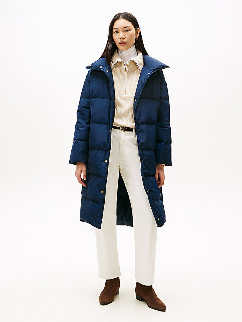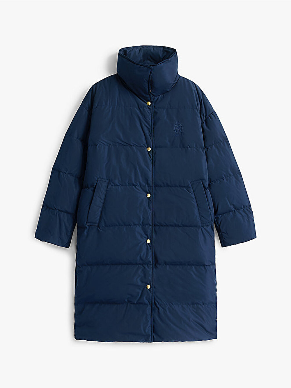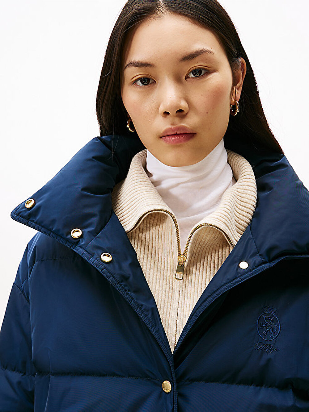 Çağdaş bir görünüm için yüksek huni yaka ile tamamlanan bu su itici kaz tüyü dolgulu şişme mont ile soğuk havaları kucaklayın.