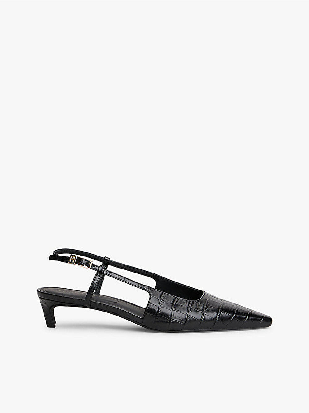 İster ofis ister akşam görünümü olsun, bu ince kedi topuklu ayakkabı timsah desenli deri saya ile mükemmel bir son dokunuş sunuyor.