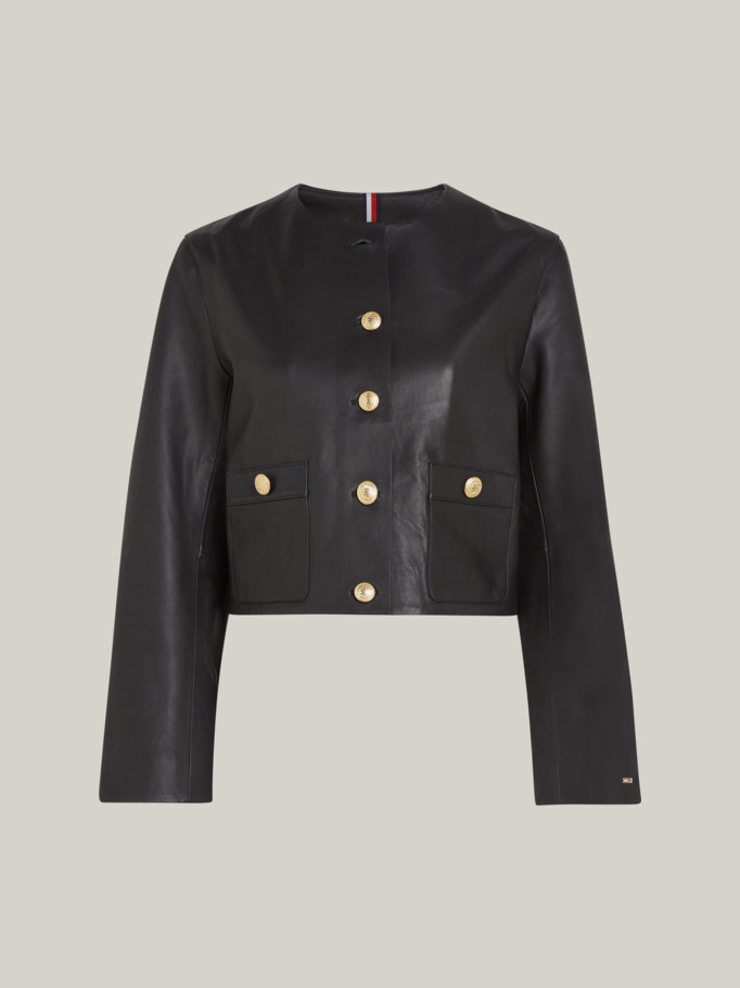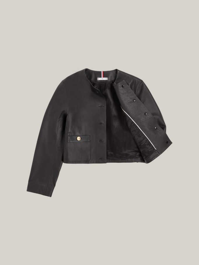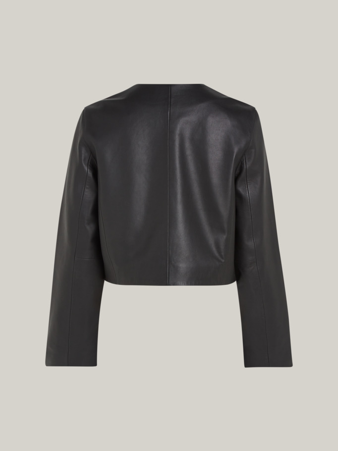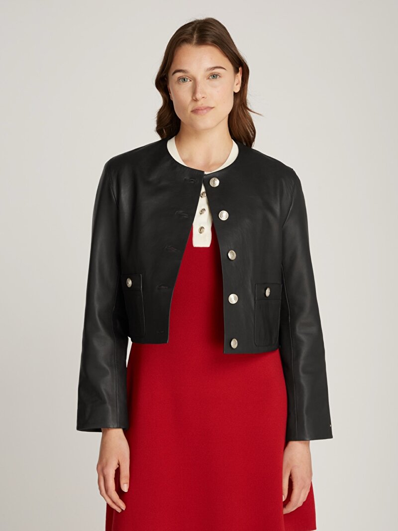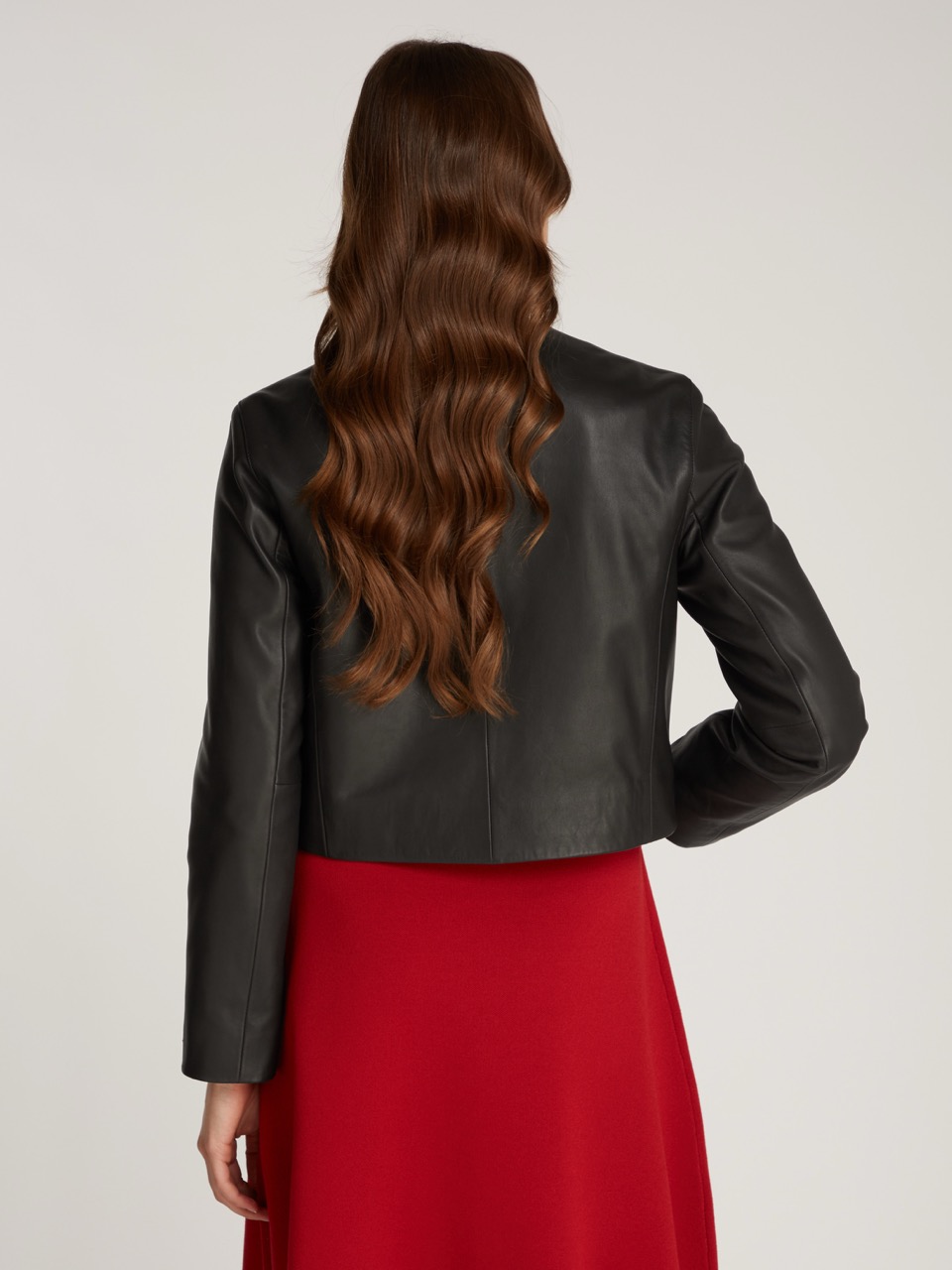 Yumuşak deriden yapılmış bu çağdaş crop kesim ceket, özel günlerinize şık bir stil kazandıracak.