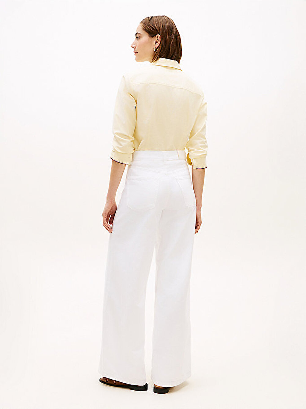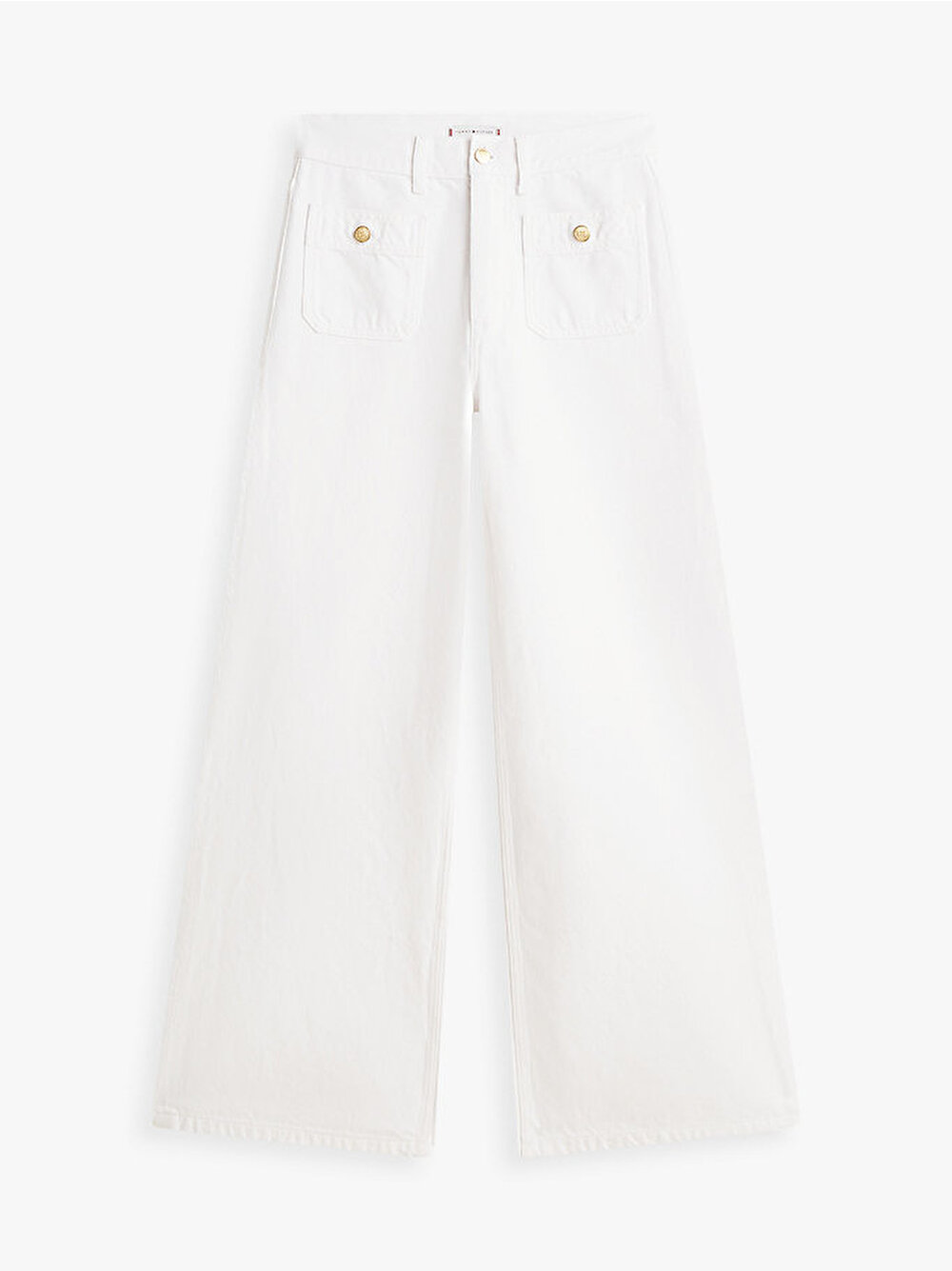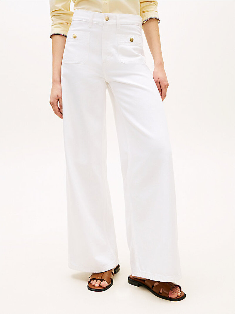 - Parlak düğme detaylarıyla zenginleşen şık, wide leg silüeti ve iddialı yüksek beliyle, bu sert denim jean pantolonda 70'ler havasını yakalayın.