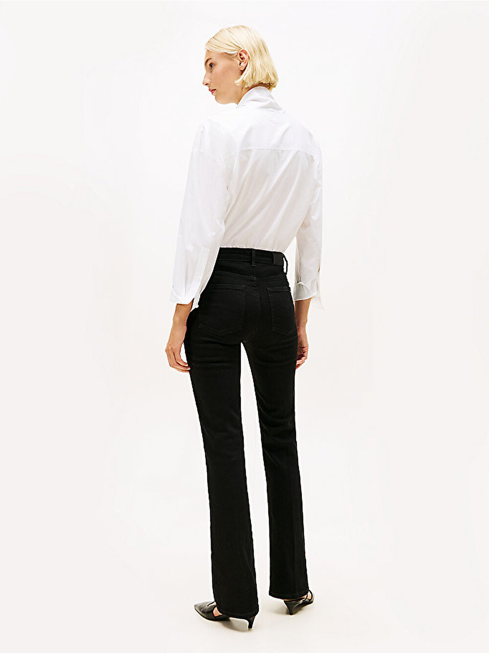 Presli bootcut kesimli bu smart jean pantolon, ön cepler ve beldeki altın tonlu logolu düğmelerle üst düzeye çıkarılıyor.