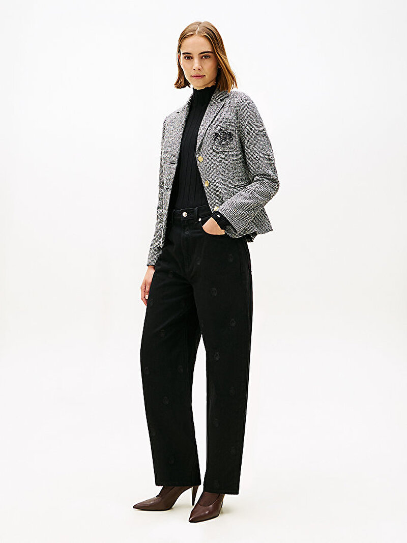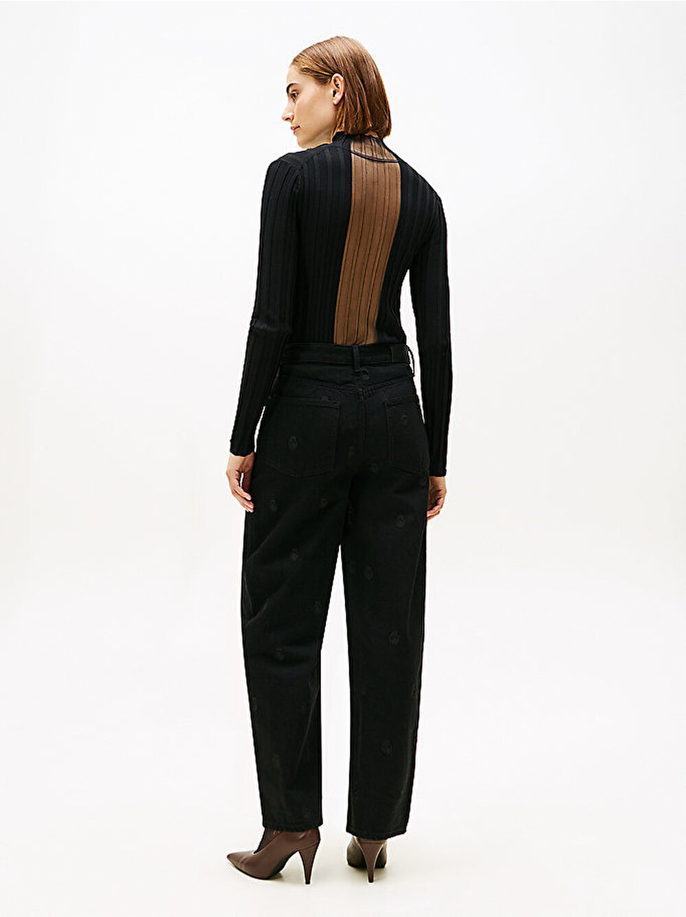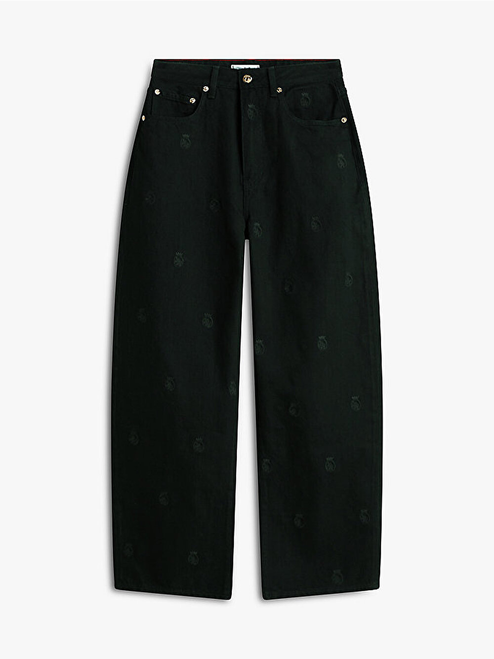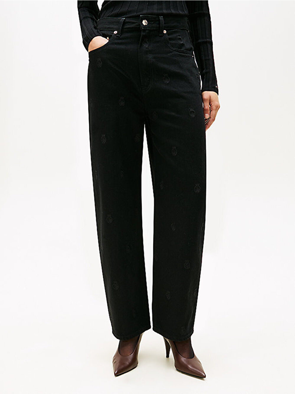 Bu siyah kot pantolonun varil paçaları, rahat bir kesim ve rahat bir siluet sağlarken, tüm yüzeyi kaplayan nakışlar ise kendine özgü bir dokunuş katıyor.