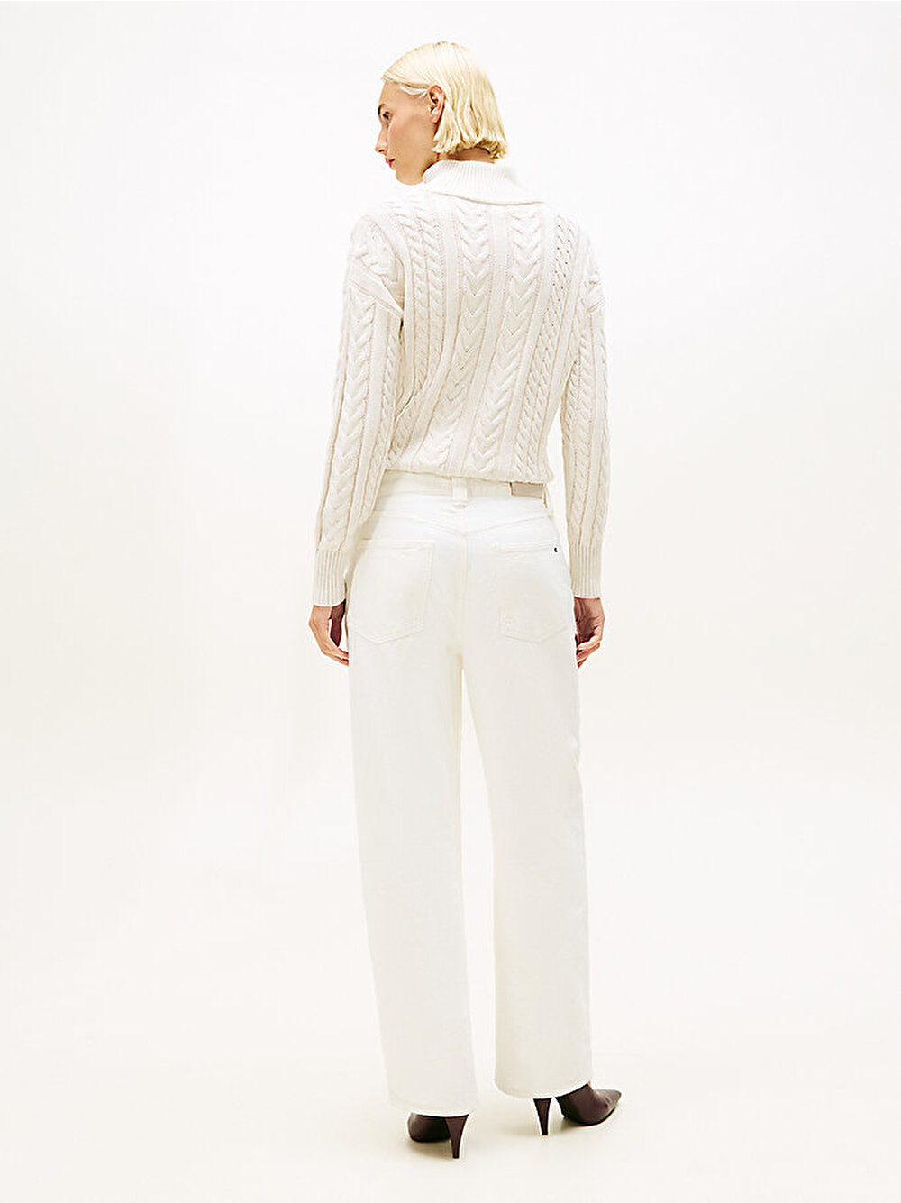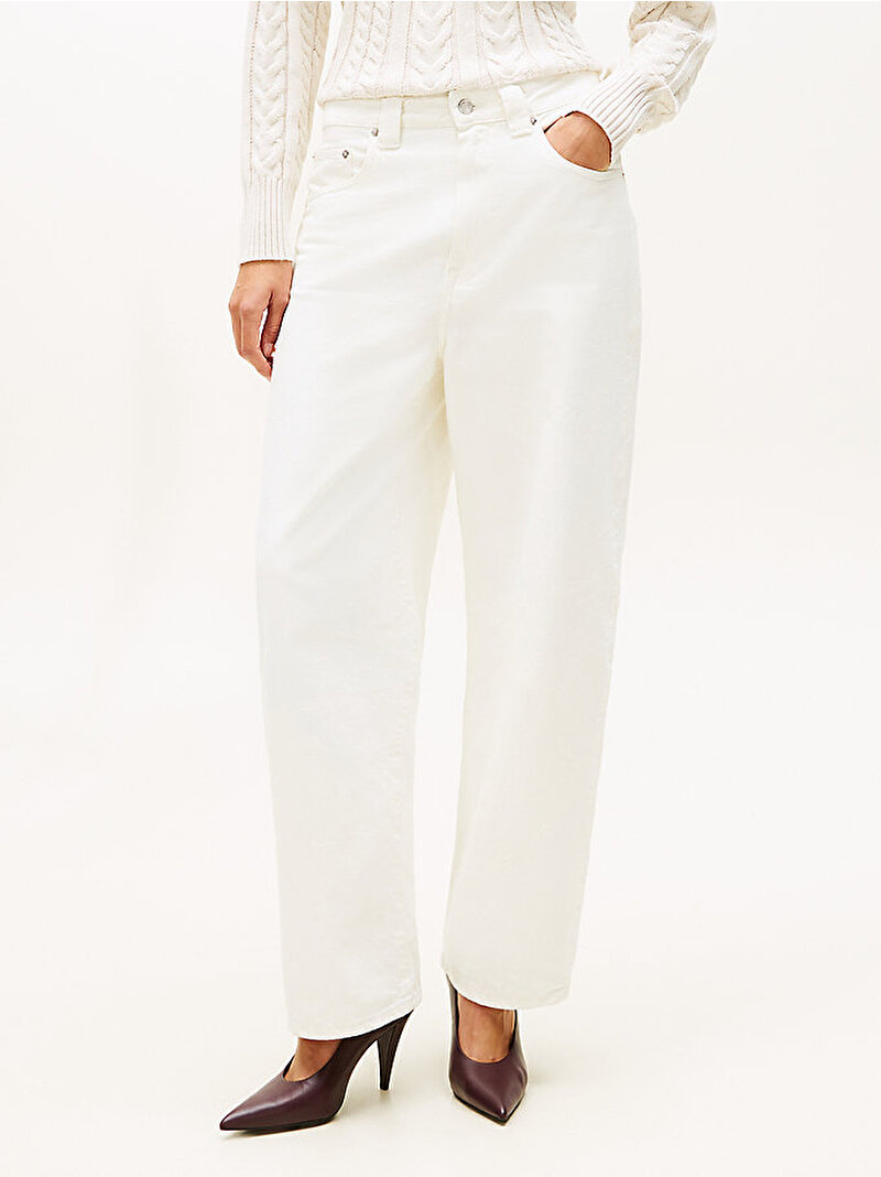 Modaya uygun varil kesim paçası ve modern bir görünüm için vücudu saran mid-rise bel bandı ile tasarlanan bu şık jean pantolonla retro esintili stili benimseyin.