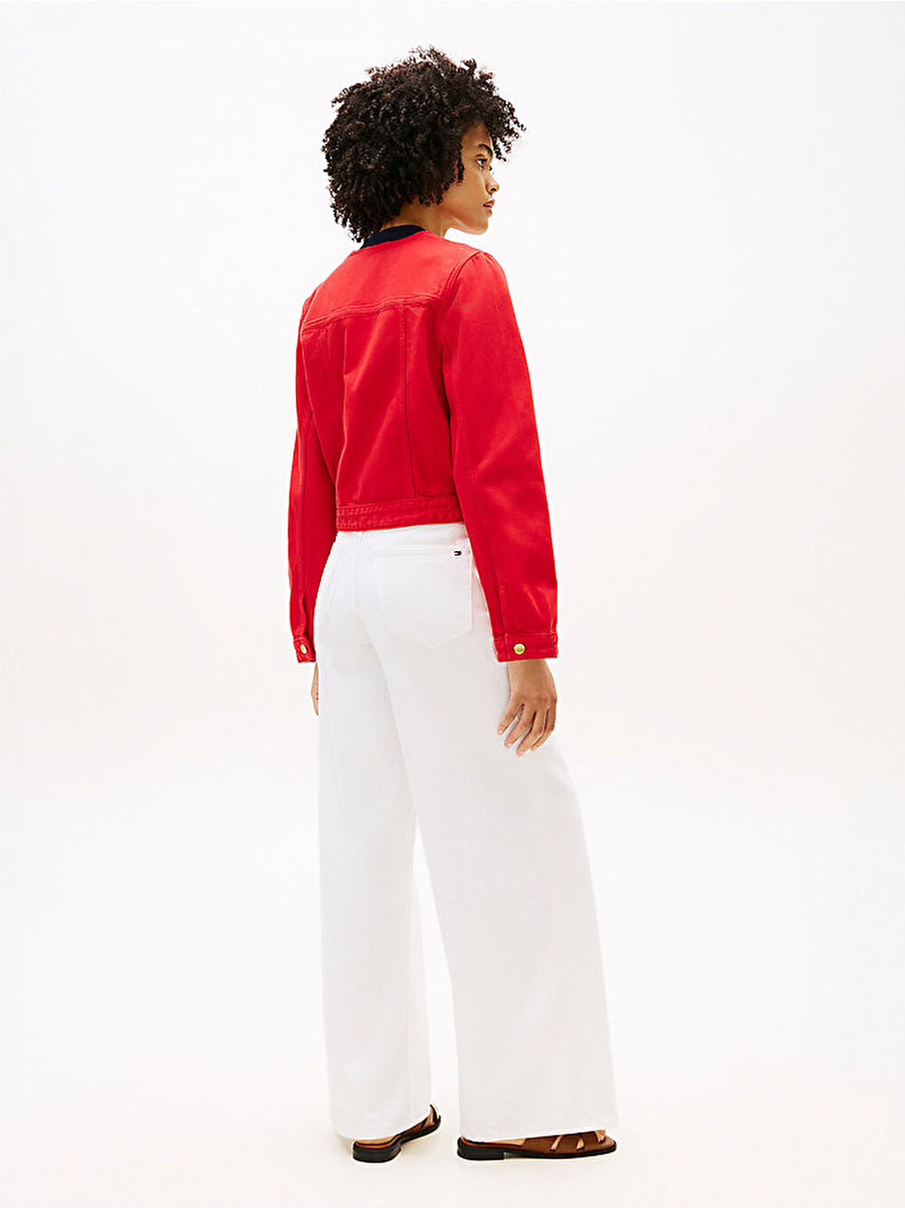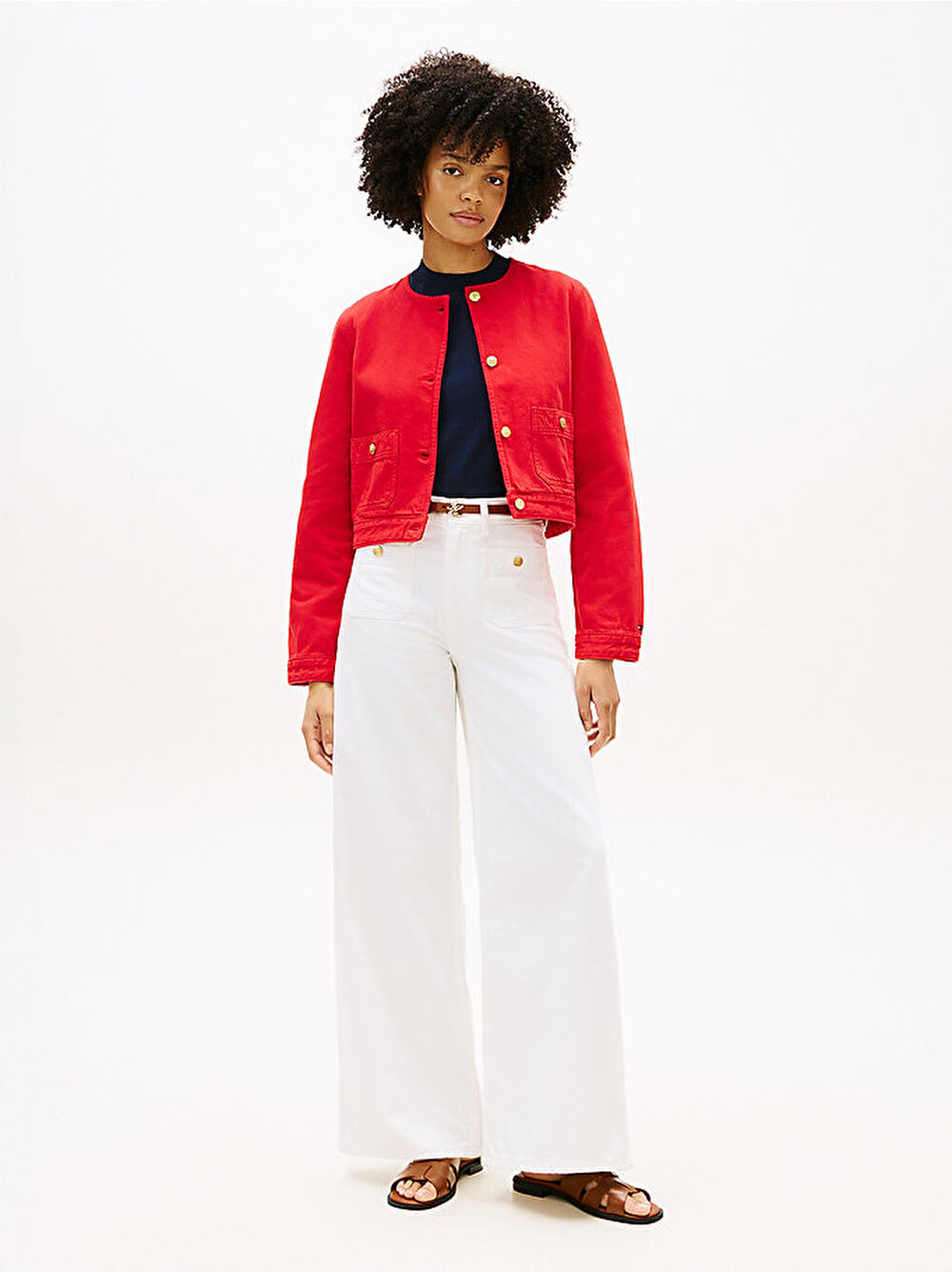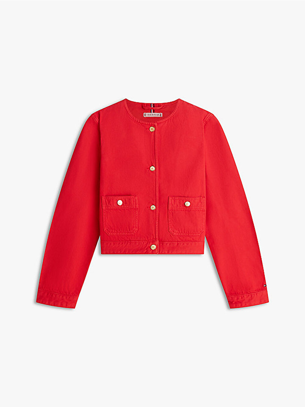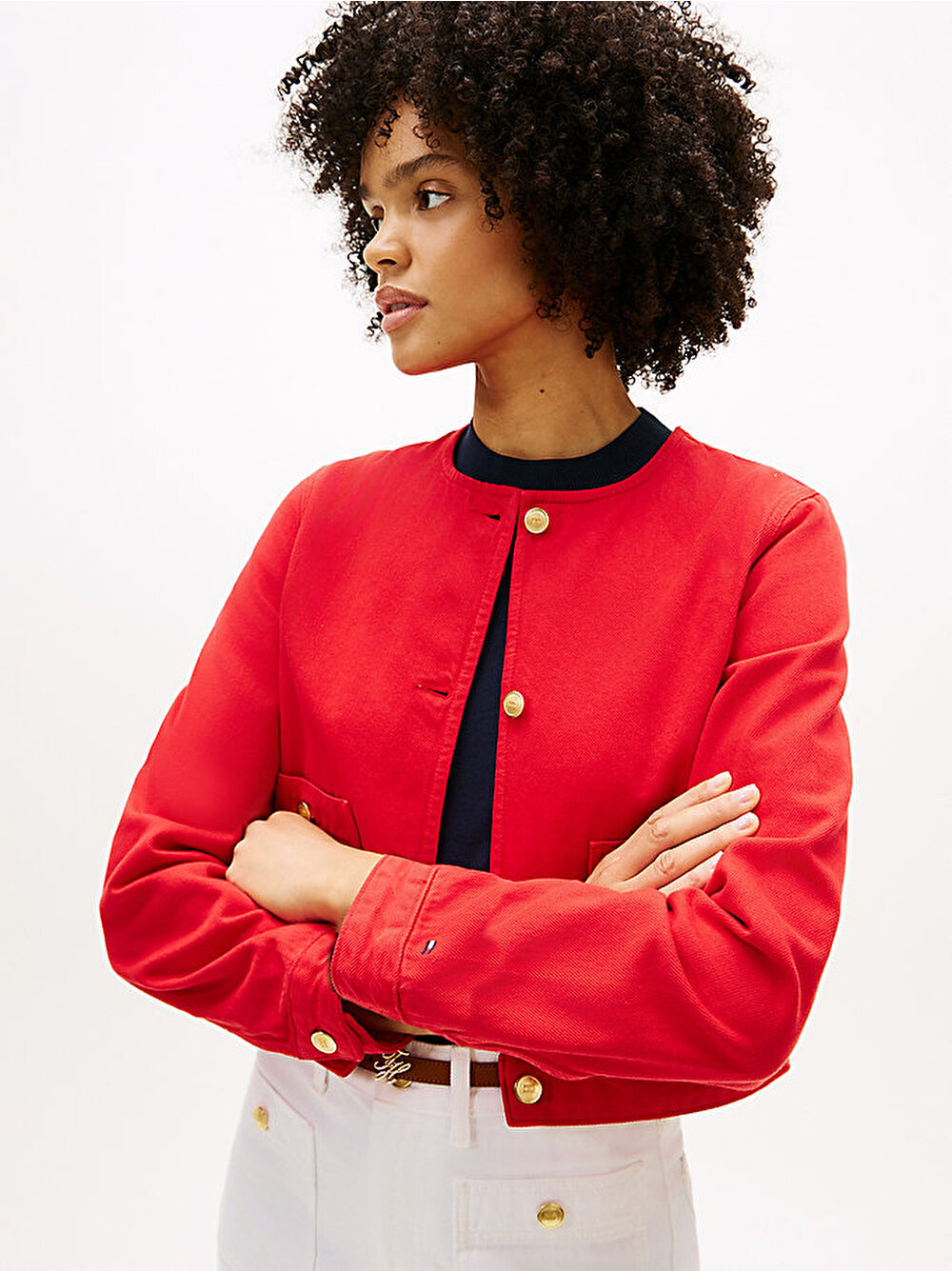 Lüks altın tonlu düğme detaylarına sahip bu yakasız denim ceket, rahat stilin ve çağdaş duruşun ideal bir birleşimi.
