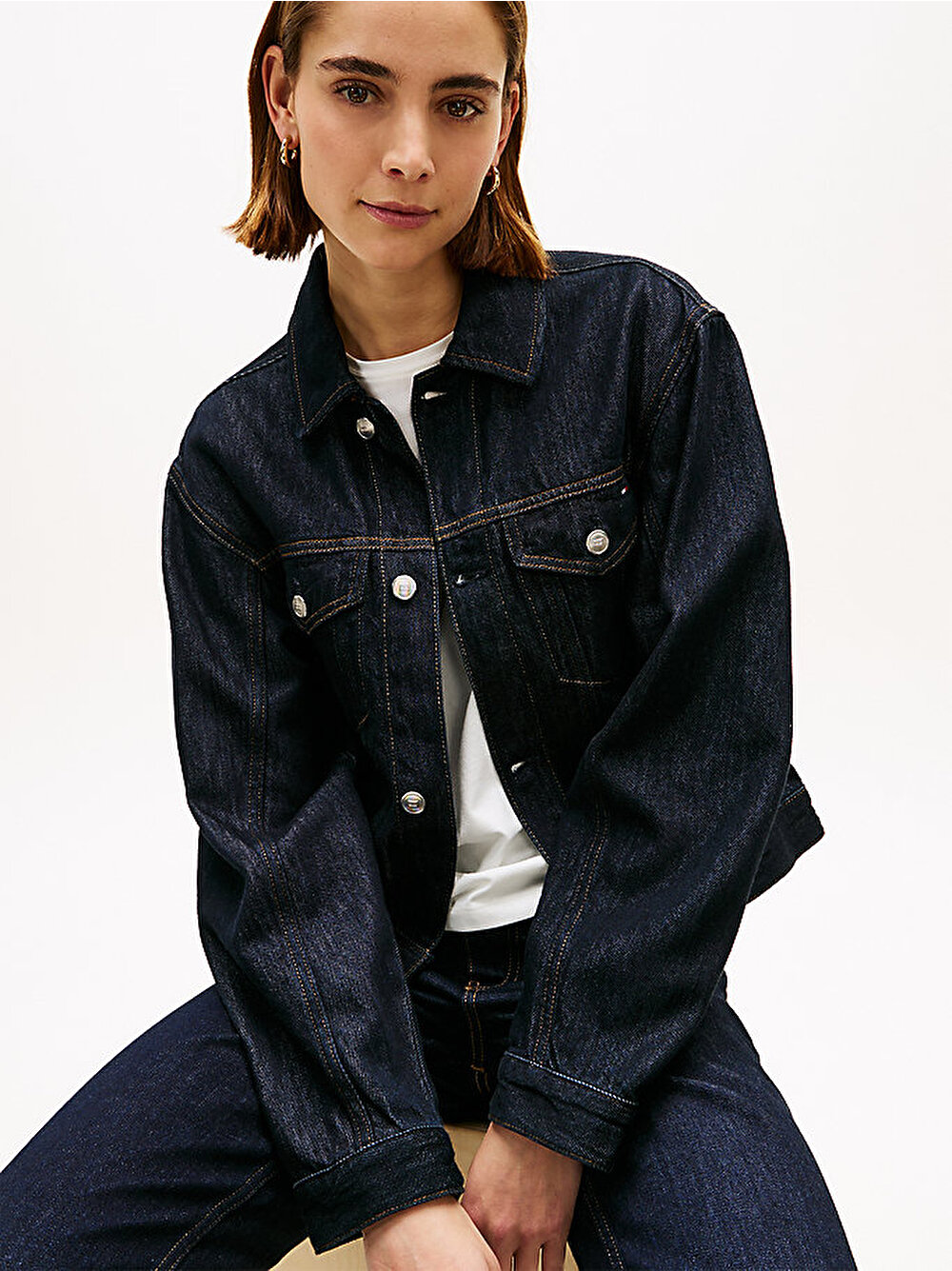 Klasik kapaklı ceplere sahip bu çarpıcı denim ceket, omuz ve sırt kısmındaki pile detaylarıyla hacimli bir siluet oluşturur.