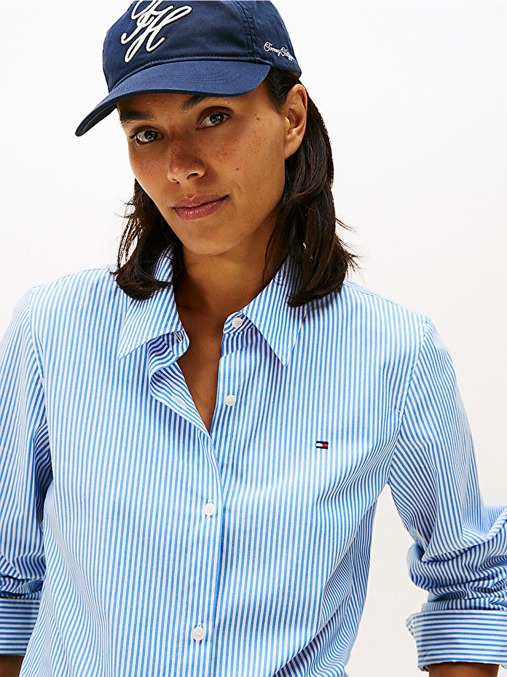 Keskin çizgili streç pamuklu poplinden yapılmış bu zamansız gömlekle iş kıyafetlerinize terzi işi bir dokunuş katın.