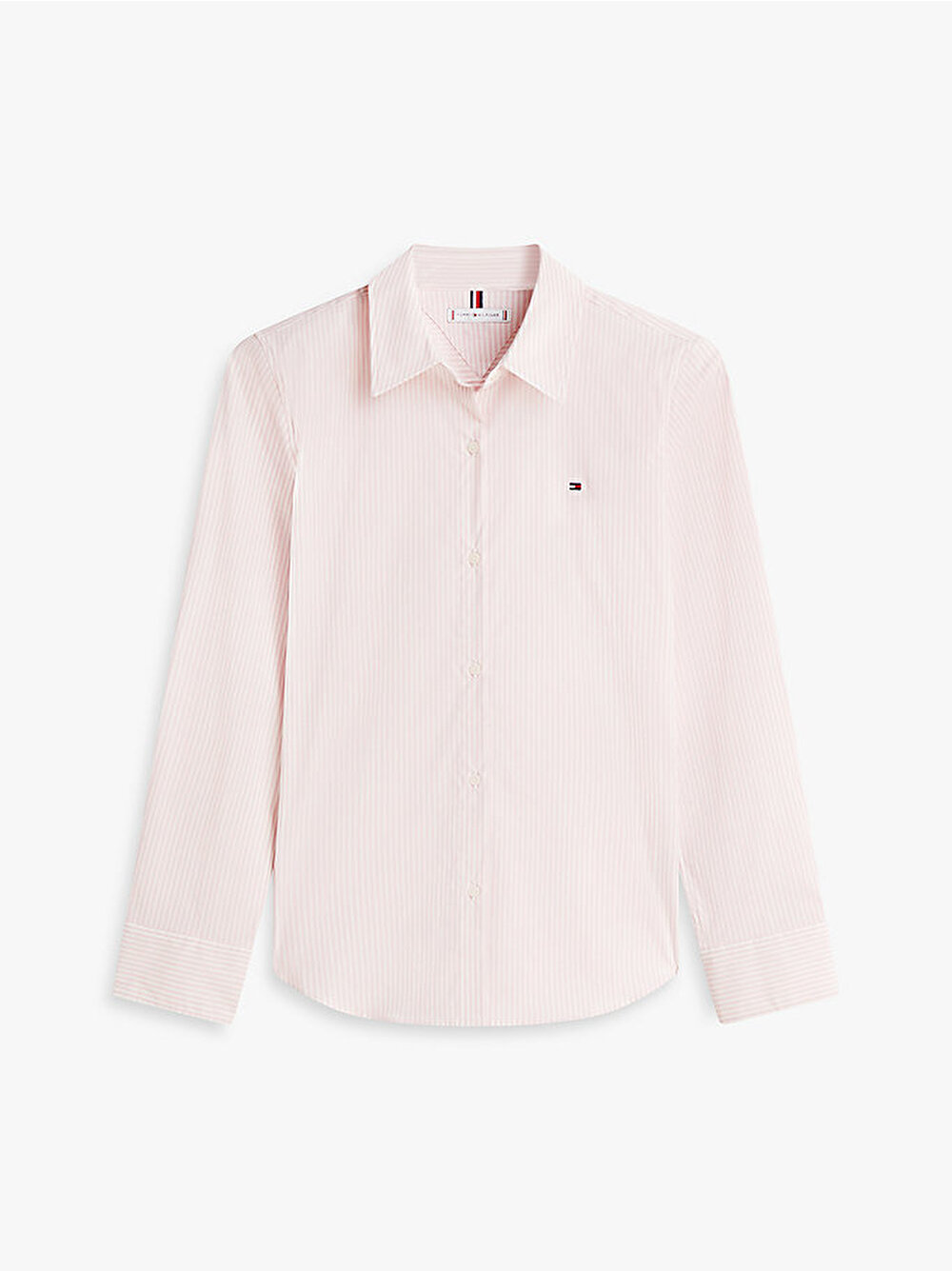 Keskin çizgili streç pamuklu poplinden yapılmış bu zamansız gömlekle iş kıyafetlerinize terzi işi bir dokunuş katın.