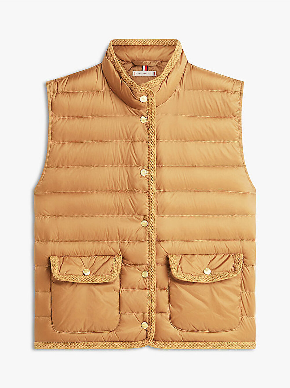 Yalıtım sağlayan lüks kuş tüyü dolgulu bu hafif yelek, örgü şerit detaylarıyla köklü bir moda mirasını yansıtan estetik bir görünüm sunuyor.