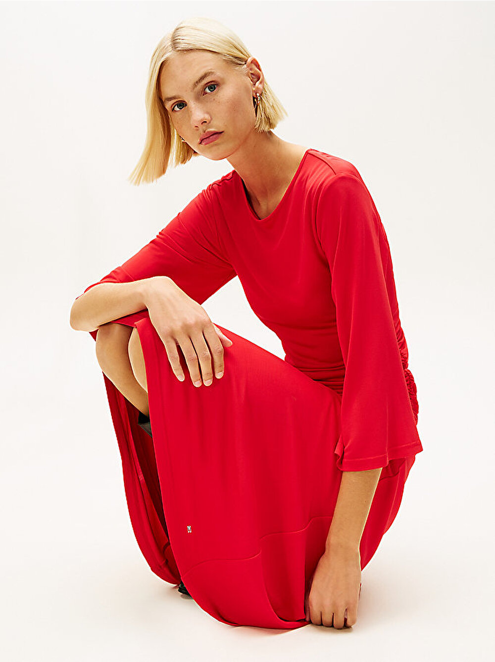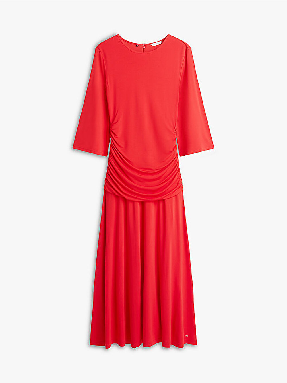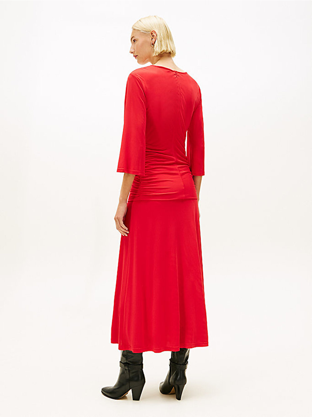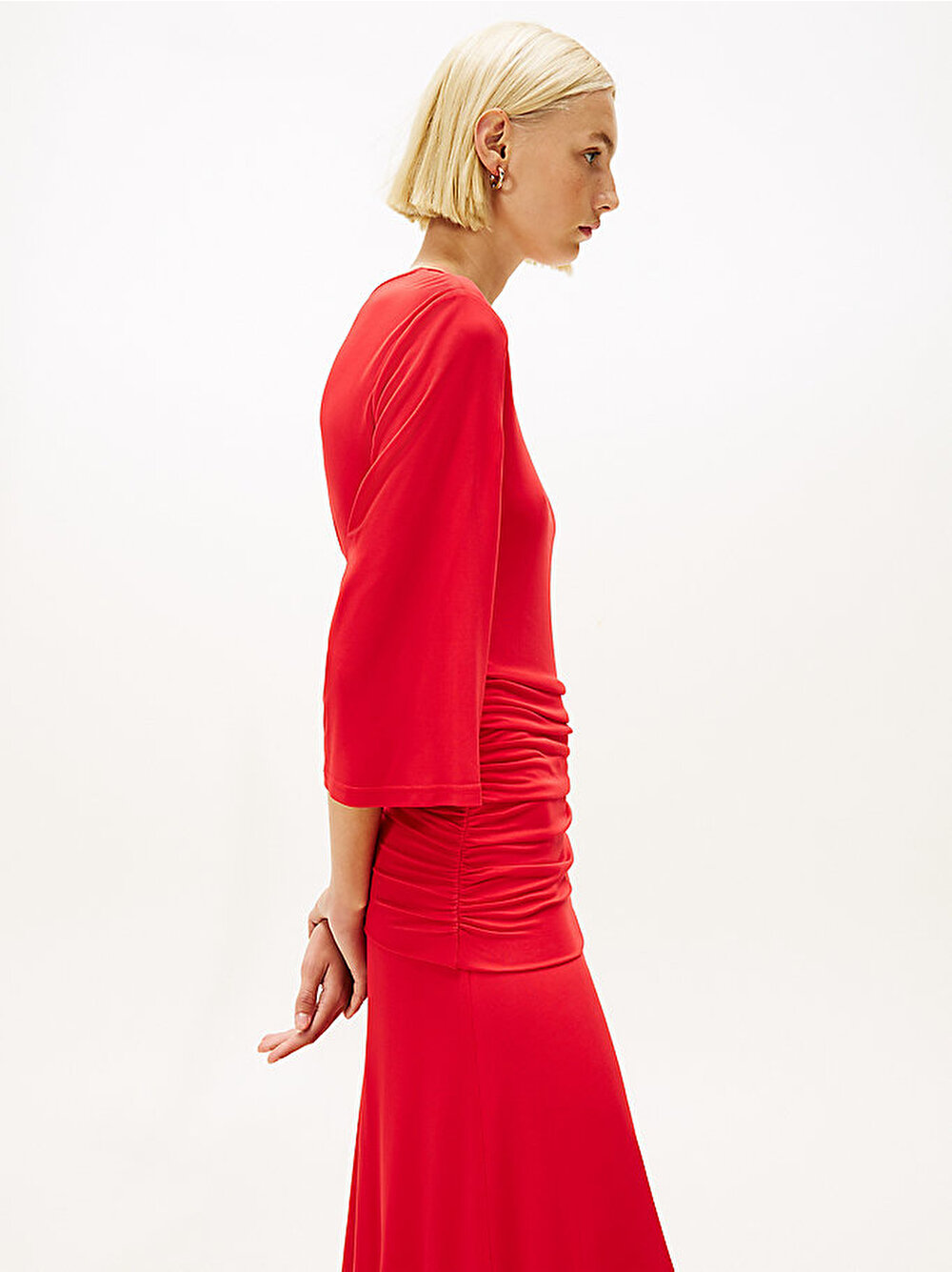 Dökümlü krepe kumaştan üretilen bu midi elbise, bel kısmındaki büzgü detayıyla hareket kazandırarak davet sezonu için mükemmel bir seçenek sunar.