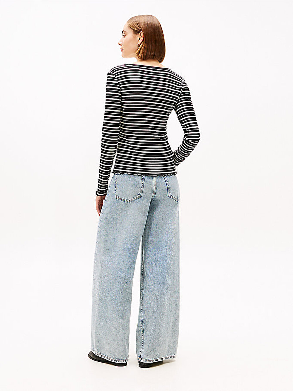 Feminen geniş yaka tasarımına sahip bu hafif ribanalı slim fit tişört, fırfırlı etek ucu ve sade bayrak detayı gibi zarif dokunuşlarla tamamlanmıştır.
