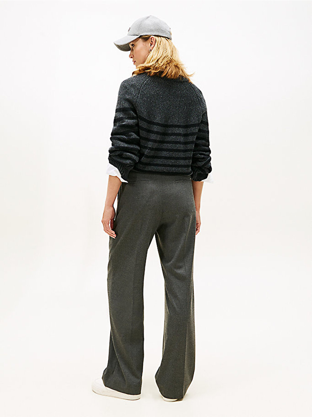 Streç flanel kumaş ve ön kısımdaki pileler, rahat kesimli bu straight leg pantolona dökümlü bir etki katıyor.