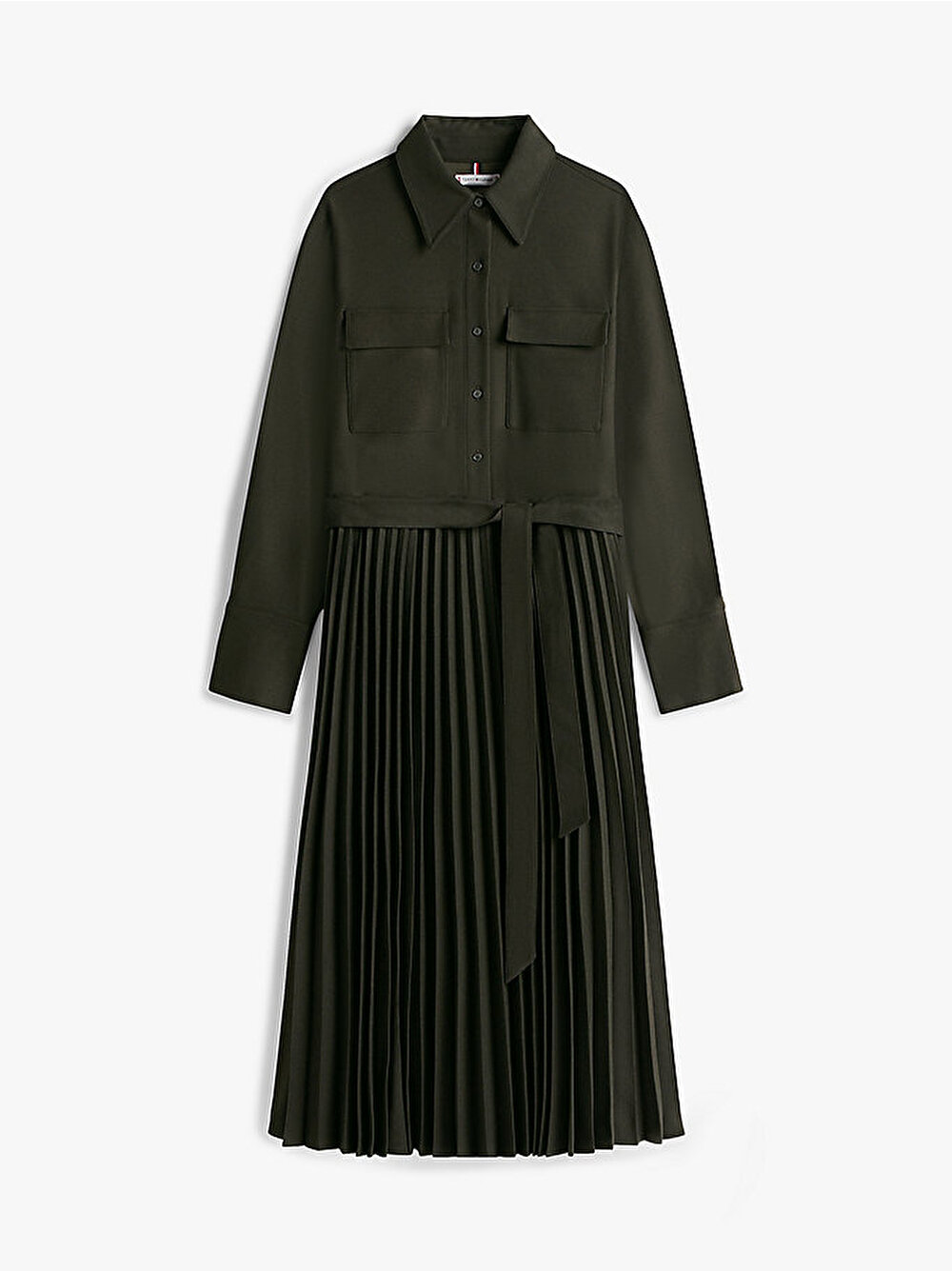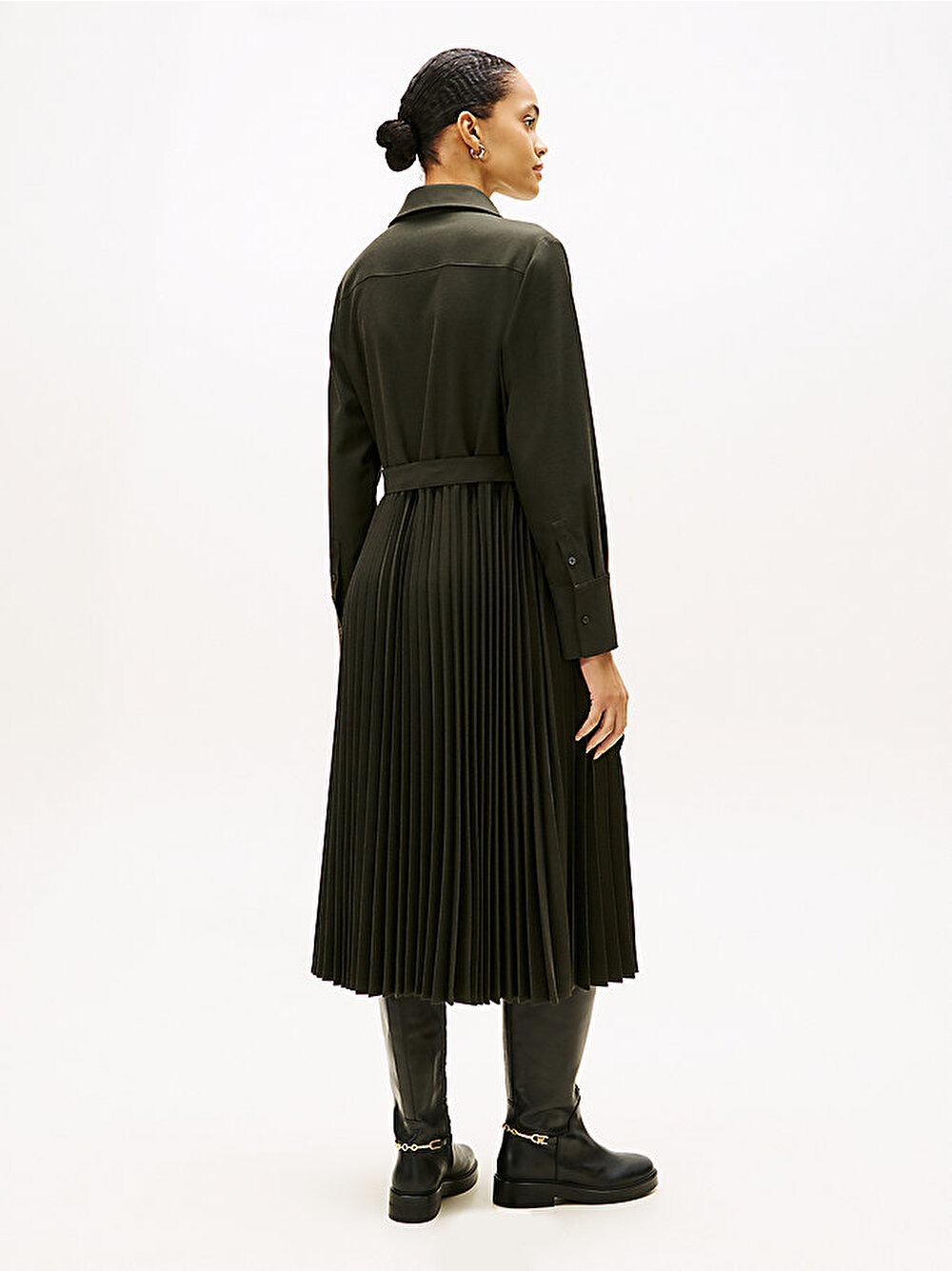 İşlevsel tasarım ve feminen stil, zarif bir hareket katmak için orta boy eteğinde baştan aşağı pileler bulunan bu güzel gömlek elbisede bir araya geliyor.