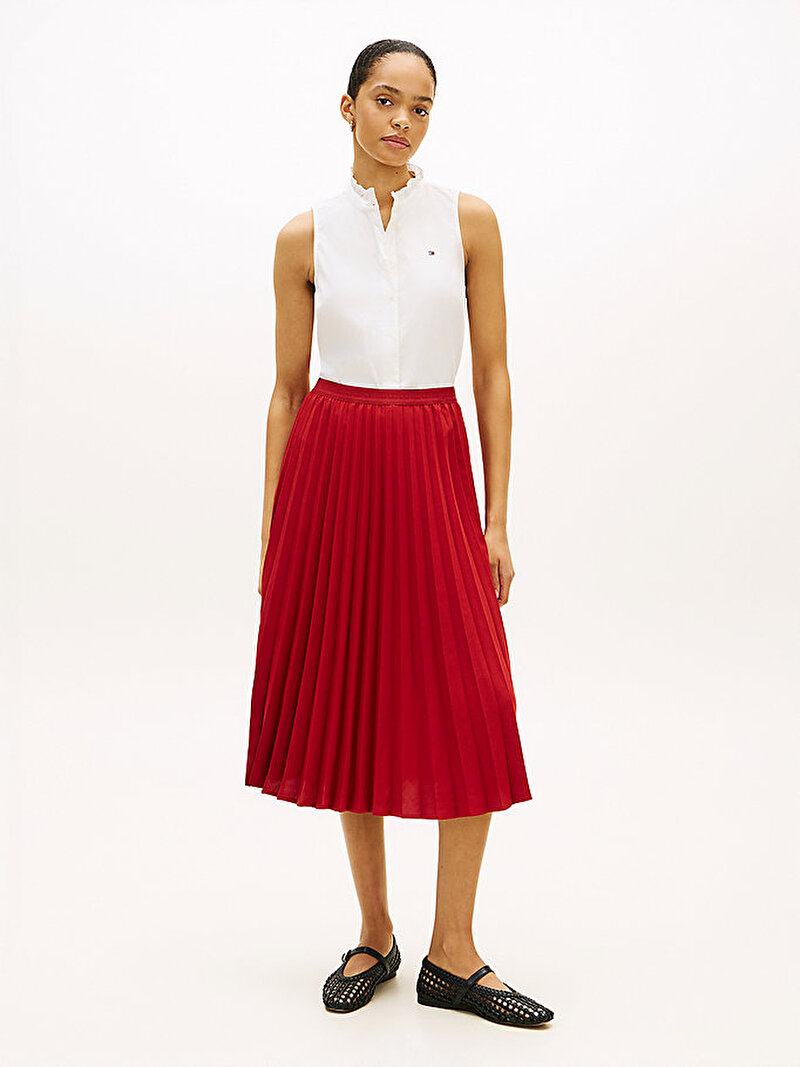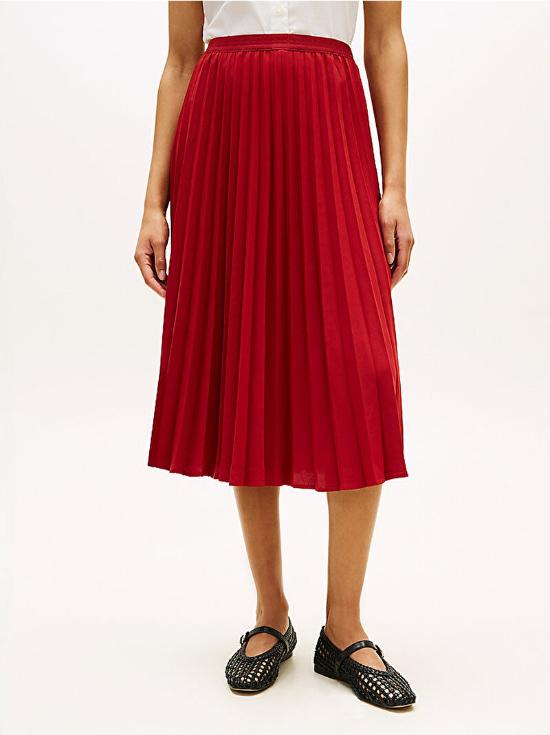 - Tonal marka dokunuşuyla daha rafine bir görünüm için; tamamı pileli dikkat çekici tasarıma sahip bu akışkan midi eteği tercih edin.