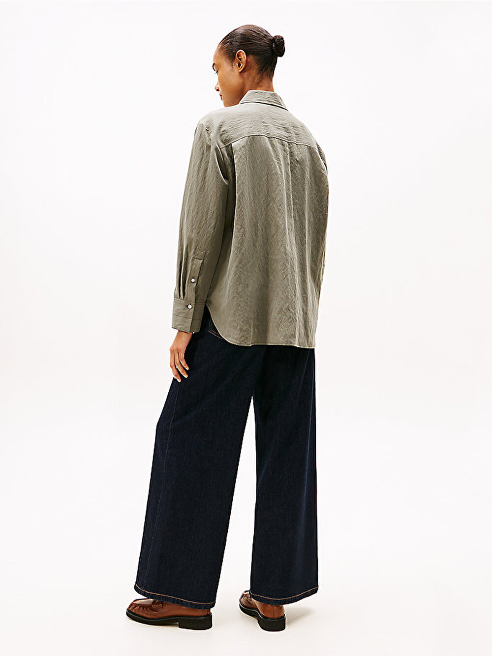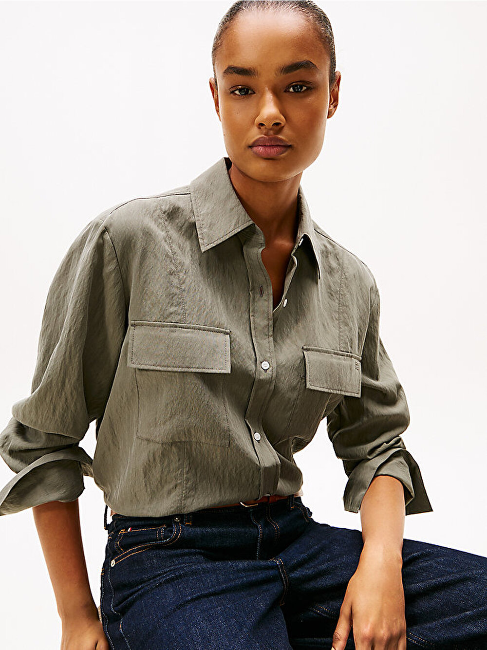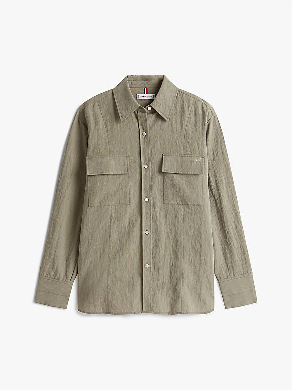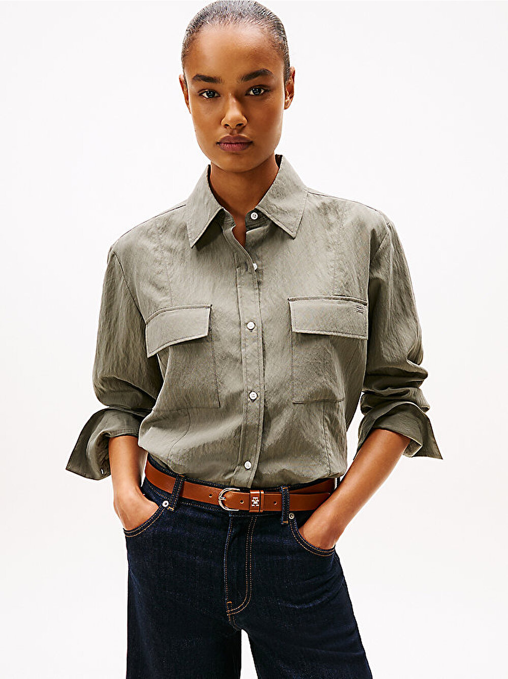Kırışık kumaş, işlevsel tasarımlı cepler ve rahat kesimin birleşimi bu gömleğe şık bir estetik kazandırıyor.