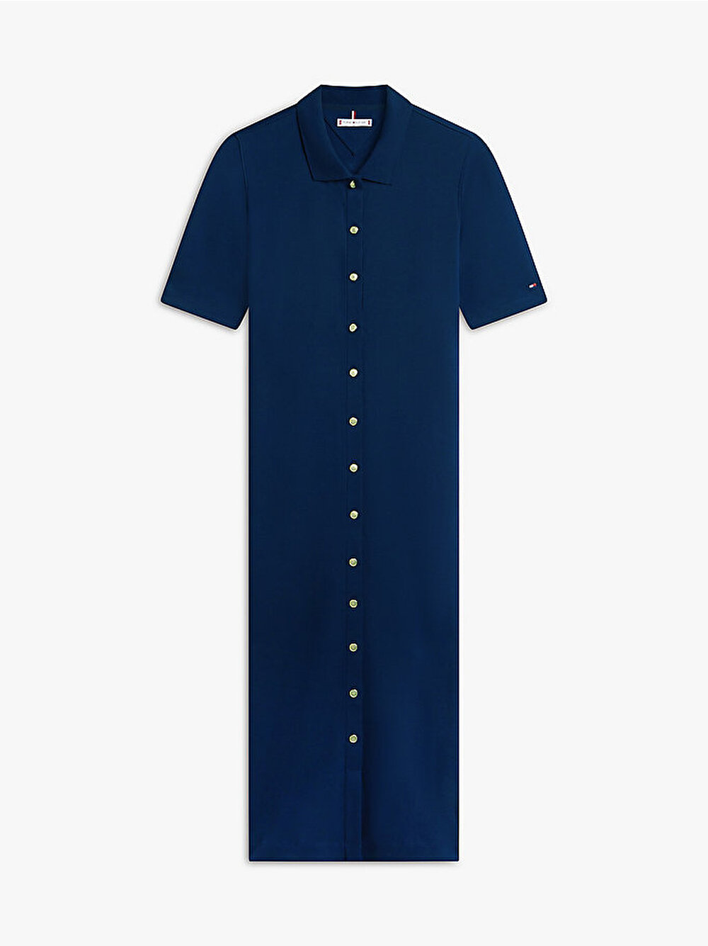 - Lüks bir ipeksi doku için saf pamuktan üretilen ve kabartmalı altın tonlu düğmelerle zenginleştirilen bu polo yakadan ilham alan midi boy elbise ile zamansız zarafeti benimseyin.