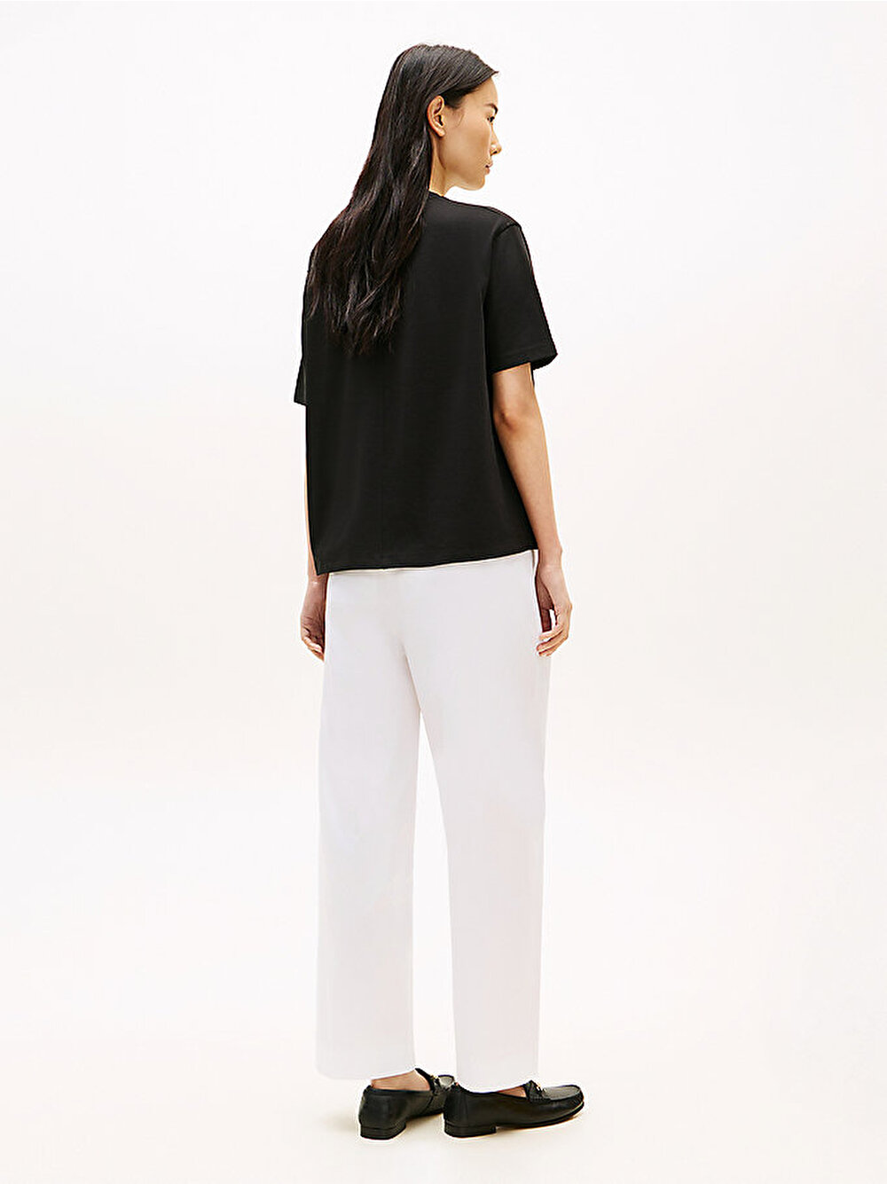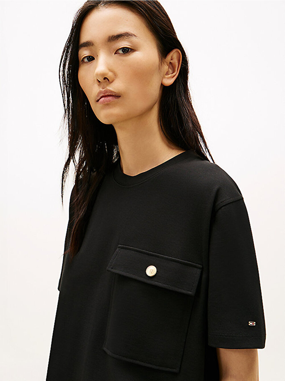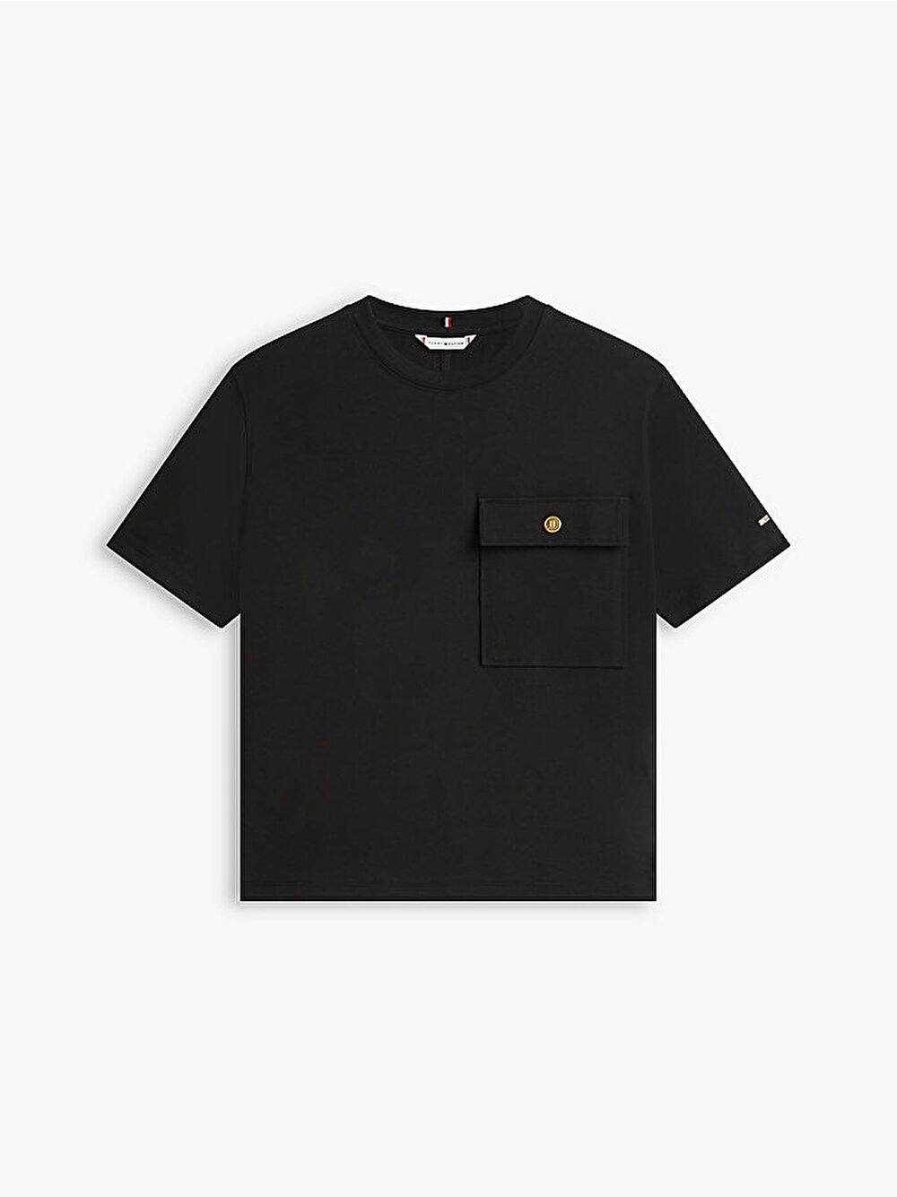 - Bu rahat kesim tişört, göğüs cebindeki logolu altın tonlu düğme ve koldaki parlak metal bayrak ile üst seviyeye taşınıyor.