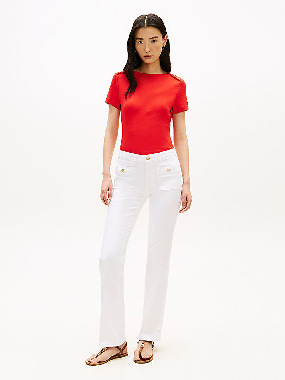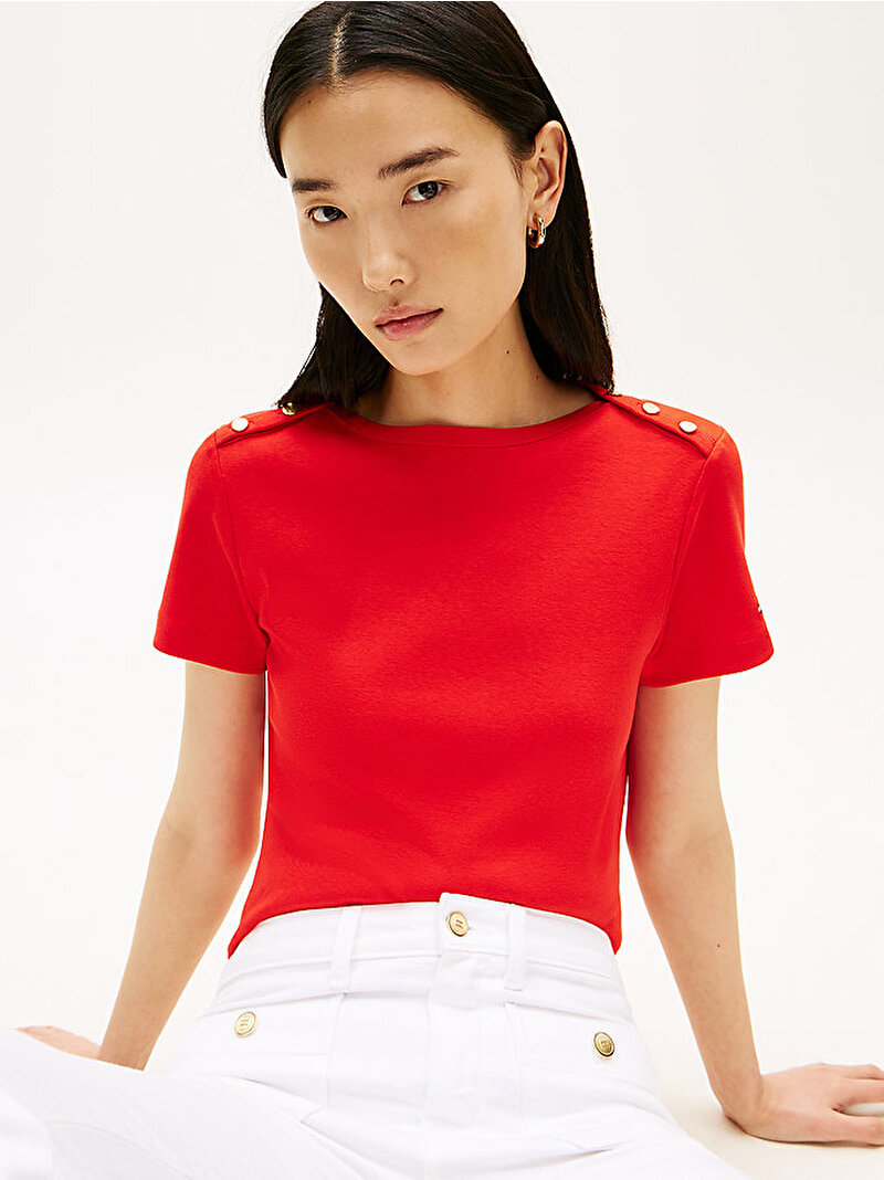 - Kayık yaka ve altın tonlu omuz düğmeleriyle tamamlanan bu ipeksi slim fit tişört, günlük stilinize ışıltılı bir dokunuş katıyor.